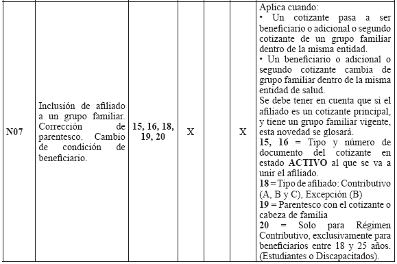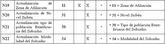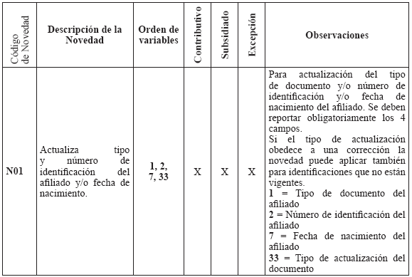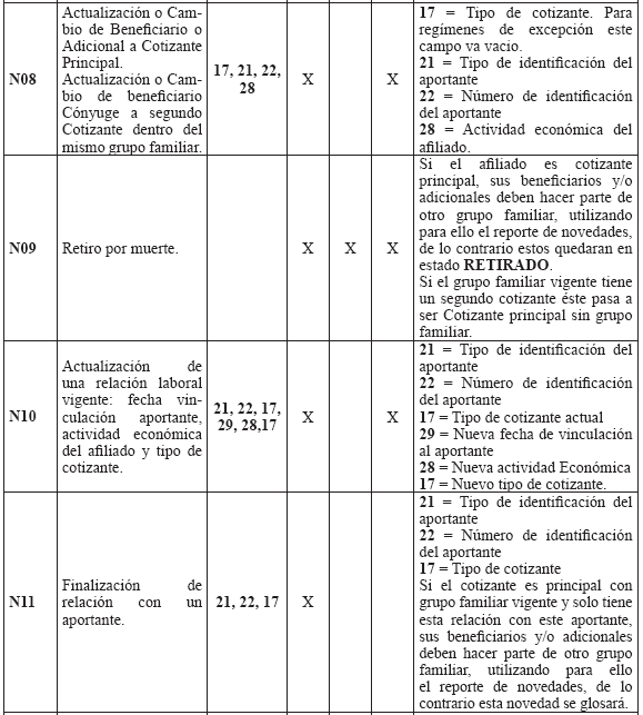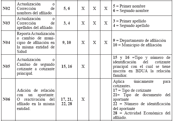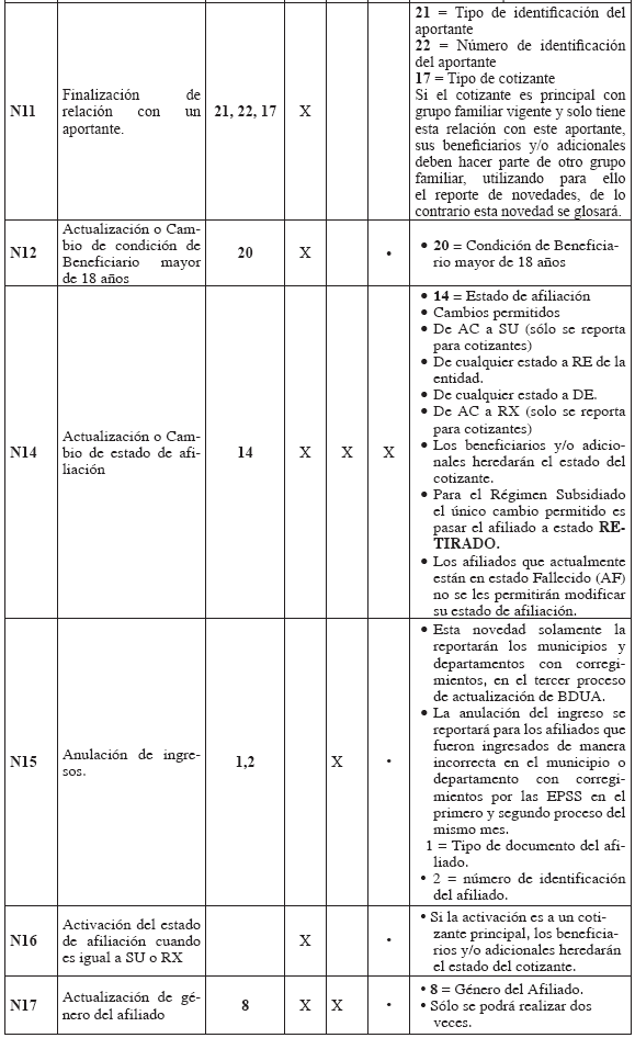 Estructura del archivo de novedades Aplica para todos los Regímenes: Contributivo, Subsidiado, Exceptuados, Medicina Prepagada y Seguros de Salud. Novedades de actualización de datos Las Entidades deben mantener actualizada la información de sus afiliados mediante el envío de novedades, reportando para ellas el código de la novedad y su fecha de inicio en la estructura de la TABLA 9. "ESTRUCTURA DEL ARCHIVO DE NOVEDADES". Las novedades de actualización deben ser presentadas únicamente por las Entidades que tienen el afiliado en la BDUA (de acuerdo con los códigos de la Tabla 10. "CÓDIGOS DE NOVEDADES"). Las Entidades deberán remitir las novedades de cada afiliado en el orden en que deben cargarse en la BDUA con el fin de garantizar la consistencia de la información. consistencia de la información. TABLA 9. ESTRUCTURA DEL ARCHIVO DE NOVEDADES