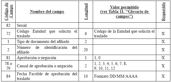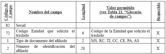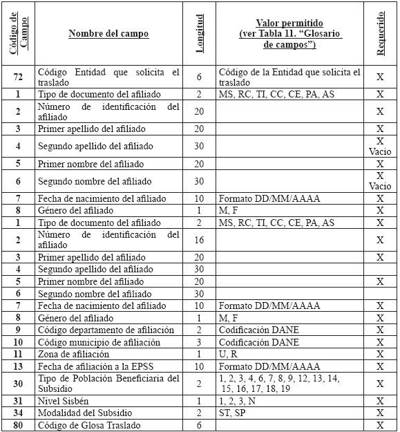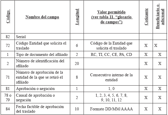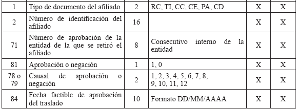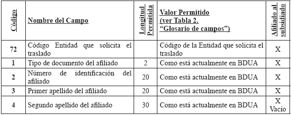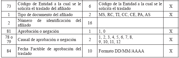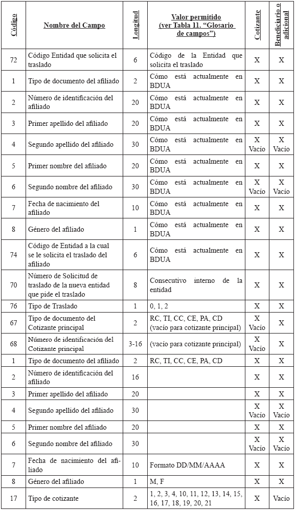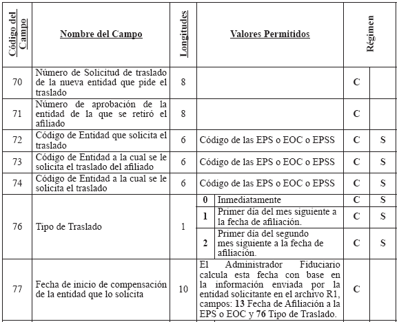 Cuando una entidad le presente en un mismo período más de una novedad a un afiliado, se debe diligenciar un registro por cada novedad y se aplicarán en el orden que la entidad lo reporte de acuerdo con el campo "Consecutivo de la Novedad". 3. Solicitud y autorización de traslado afiliados en BDUA por parte del régimen contributivo A continuación se define la forma en que se aplicarán los traslados de los afiliados en la BDUA y que están soportados en solicitudes y autorizaciones a los mismos por parte de las entidades. En ningún momento se releva a las Entidades de su responsabilidad legal de administrar la afiliación. El presente anexo establece el registro ante la Base de Datos Única de Afiliados BDUA de un proceso que debió darse, siguiendo toda la normativa vigente. Glosario de términos del módulo de traslados Solicitud de Traslado en BDUA: Es la petición que realiza una entidad para que aquella que tiene registrado el afiliado en la BDUA autorice o niegue su movilidad en la base de datos. Entidad 1: entidad que tiene registrado el afiliado en la BDUA al momento de la solicitud de traslado. Esta dará la aceptación o negación a cada uno de los registros reportados en la solicitud. Entidad 2: entidad que remite la solicitud de traslado en la BDUA a la entidad 1, a través del Administrador Fiduciario del Fosyga, en el archivo R 1. R 1: Archivo con la información de los afiliados que debe presentar la entidad 2 para realizar la solicitud de traslado en la BDUA a la entidad 1 a través del Administrador Fiduciario del Fosyga, conforme la estructura establecida en el presente anexo. Para el caso que el afiliado que se pretenda trasladar pertenezca al Régimen Subsidiado, la entidad 2 también deberá realizar el archivo R 1 solamente que estos afiliados se trasladarán automáticamente sin surtir el resto del proceso de los RS. R 2: Archivo con la información de los afiliados que envía el Administrador Fiduciario del Fosyga a la entidad 1 como solicitud del traslado en BDUA, conforme la estructura establecida en el presente anexo. R 3: Archivo con inconsistencias, enviado por el Administrador Fiduciario del Fosyga a la entidad 2 en caso de encontrarse glosas en la verificación del afiliado en la BDUA. R 4: Archivo con la respuesta a la solicitud de la entidad 2, enviado por la entidad 1 al Administrador Fiduciario del Fosyga. R 5: Es el resultado que entrega el Administrador Fiduciario del Fosyga a la entidad 2. Este archivo contiene los traslados efectivamente realizados y los registros que no, por contestación negativa por parte de la entidad 1. R 6: Es el resultado que entrega el Administrador Fiduciario del Fosyga a la entidad 2. Este archivo contiene los traslados aprobados por la entidad 1 pero que no fueron actualizados en la BDUA porque no cumplieron las validaciones de reglas de negocio, por cambios en los procesos de actualización de BDUA entre el R 1 y el R 4. Fecha de afiliación a la EPS o EOC: Corresponde a la fecha en que se suscribió el formulario de afiliación en la entidad, independientemente del momento en que inicia la prestación de servicios al afiliado por parte de dicha entidad conforme con la normatividad vigente. Proceso de autorización de traslado de afiliados en la BDUA 3.2.1. Solicitud de traslado en la BDUA de la entidad 2 a la entidad 1 Mensualmente y de acuerdo con las solicitudes de traslados que cada entidad reciba; estas remitirán al Administrador Fiduciario del FOSYGA, el archivo R 1 cuya estructura se define más adelante en el presente anexo, a más tardar el tercer (3°) día hábil del mes. 3.2.2. Actividades a realizar por el administrador fiduciario con el archivo R 1 El Administrador Fiduciario del Fosyga debe, a los dos días hábiles siguientes de la recepción del archivo R 1, remitir a la entidad 2 la respuesta de los registros que no se encuentran en la BDUA o que fueron glosados por alguna inconsistencia. Esta información se enviará en la estructura de archivo R 3 definida más adelante en el presente anexo. El Administrador Fiduciario, enviará el archivo R 2 a la entidad 1 los registros de afiliados que no fueron glosados por ningún causal. Este envío se realizará el quinto (5) día hábil del mes en el cual se recibió la solicitud. Los registros solicitados y validados después de las verificaciones hechas por el Administrador Fiduciario del Fosyga al archivo R 1, serán bloqueados y no podrán ser objeto de novedades de actualización en los procesos normales de la BDUA del mismo mes, hasta tanto no se surta todo el proceso de traslado. Igualmente, las EPS no podrán compensar los afiliados que actualmente están en el proceso de traslados. 3.2.3. Actividades a realizar por la entidad 1 con el archivo R 2 En el segundo proceso de actualización de BDUA, décimo (10°) día hábil del mismo mes en el cual se envió la solicitud de traslado, la entidad 1 enviará al administrador del Fosyga la respuesta a la solicitud de traslado hecha por la entidad 2 en el Archivo R 4 (cuya estructura se define más adelante en el presente anexo), que incluye la respuesta y la causal, de acuerdo con los códigos asignados. 3.2.4. Actividades del administrador fiduciario con el archivo R 4 El Administrador Fiduciario del Fosyga en el segundo proceso de actualización de BDUA, décimo Los registros aprobados por la entidad 1 y que no cumplan con las validaciones serán enviados a la entidad 2 en el archivo R 6. Este envío se realizará el décimo segundo (12°) día hábil del mes en el cual se realizó la solicitud de traslado en la BDUA. Además, teniendo en cuenta el artículo 31 del decreto 1703 de 2002 que indica: Artículo 31. Consulta Base de Datos. Las entidades promotoras de salud, EPS, y las de regímenes de excepción, al momento de recibir toda nueva solicitud de afiliación o traslado, bien sea en calidad de beneficiario o cotizante, deberán consultar la base de datos de afiliados de la Superintendencia Nac