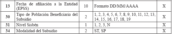 Para los cotizantes independientes que son empleadores de uno o más afiliados deberá registrarse en esta tabla como aportante. En el caso de un cotizante independiente que no es empleador no se debe reportar en este maestro. 2.2.2. Régimen Subsidiado Aplica para las Entidades Promotoras de Salud del Régimen Subsidiado (EPSS) y las Direcciones Municipales de Salud. La información de esta tabla corresponde a los datos que las entidades, deben remitir al Administrador Fiduciario del Fosyga, independientemente de todos los datos necesarios para mantener plenamente identificados y localizados a sus afiliados en la entidad, así como para atender los requerimientos especiales de las entidades de control para el ejercicio de las labores de vigilancia, inspección y control. TABLA 6. ESTRUCTURA DEL ARCHIVO MAESTRO DE AFILIADOS AL RÉGIMEN SUBSIDIADO