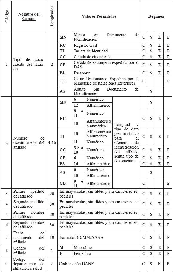 5. Glosario de campos En el siguiente glosario se presentan los valores permitidos para las variables que deben ser reportadas al Administrador Fiduciario del Fosyga para la actualización de la Base de Datos Única de Afiliados –BDUA–. En la columna CÓDIGO se registra el consecutivo asignado en este anexo a cada variable; en la columna NOMBRE DEL CAMPO la descripción de la variable; en la columna LONGITUD DEL CAMPO el tamaño máximo que puede tener el dato o según las especificaciones individuales del mismo; en la columna VALORES PERMITIDOS se registran los valores aceptados para cada variable y su descripción y en RÉGIMEN se indica a qué régimen (Contributivo –C–, Subsidiado –S–, Excepción –E–, Prepagadas o pólizas de salud –P–) es aplicable. La segunda tabla de este glosario hace referencia a los términos y convenciones utilizadas en la parte 3 y 4 del presente anexo que están relacionados con el reporte de información para la actualización de los traslados de afiliados ante la BDUA. TABLA 11 GLOSARIO DE CAMPOS ARCHIVOS MAESTROS Y DE NOVEDADES