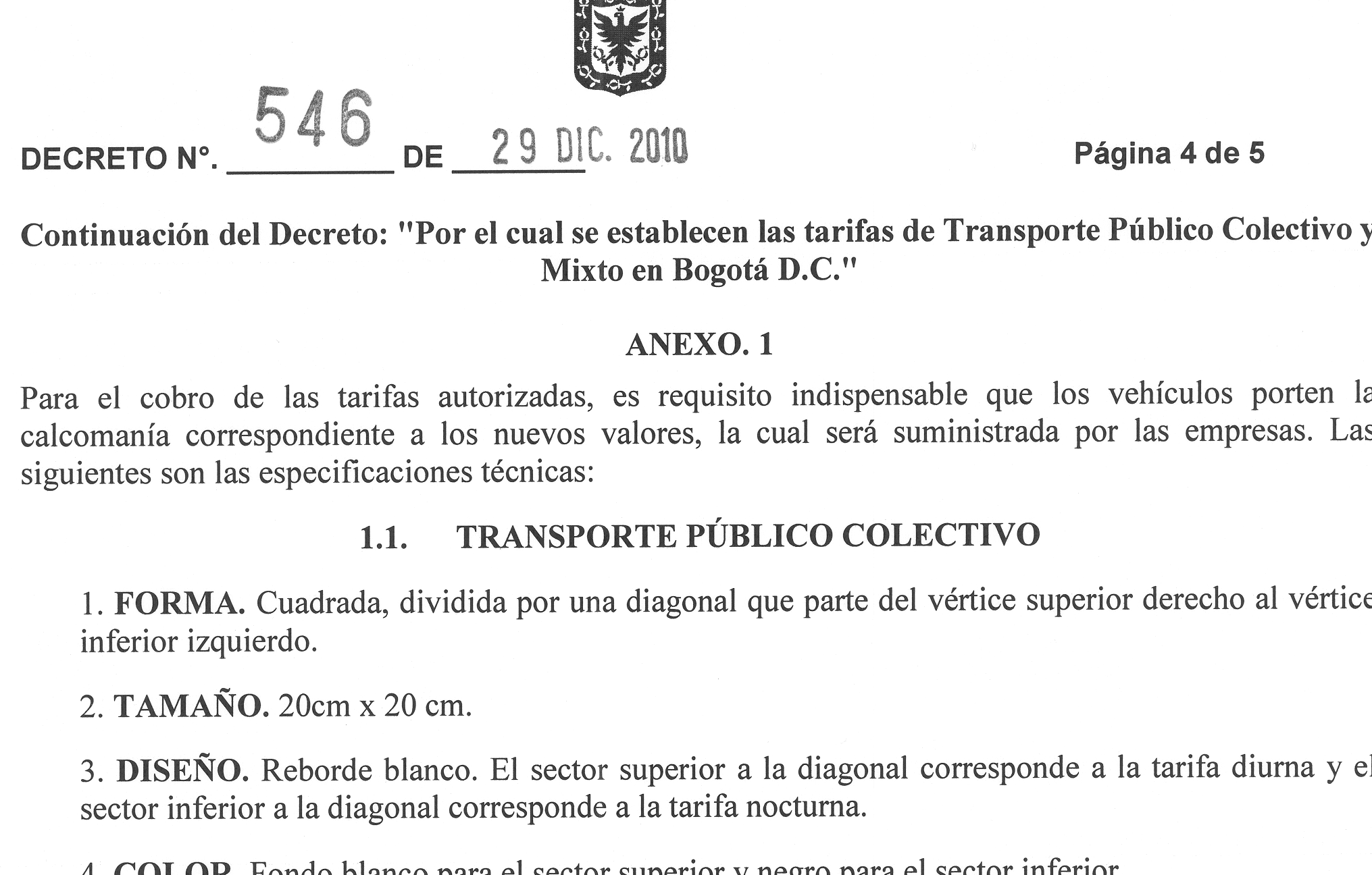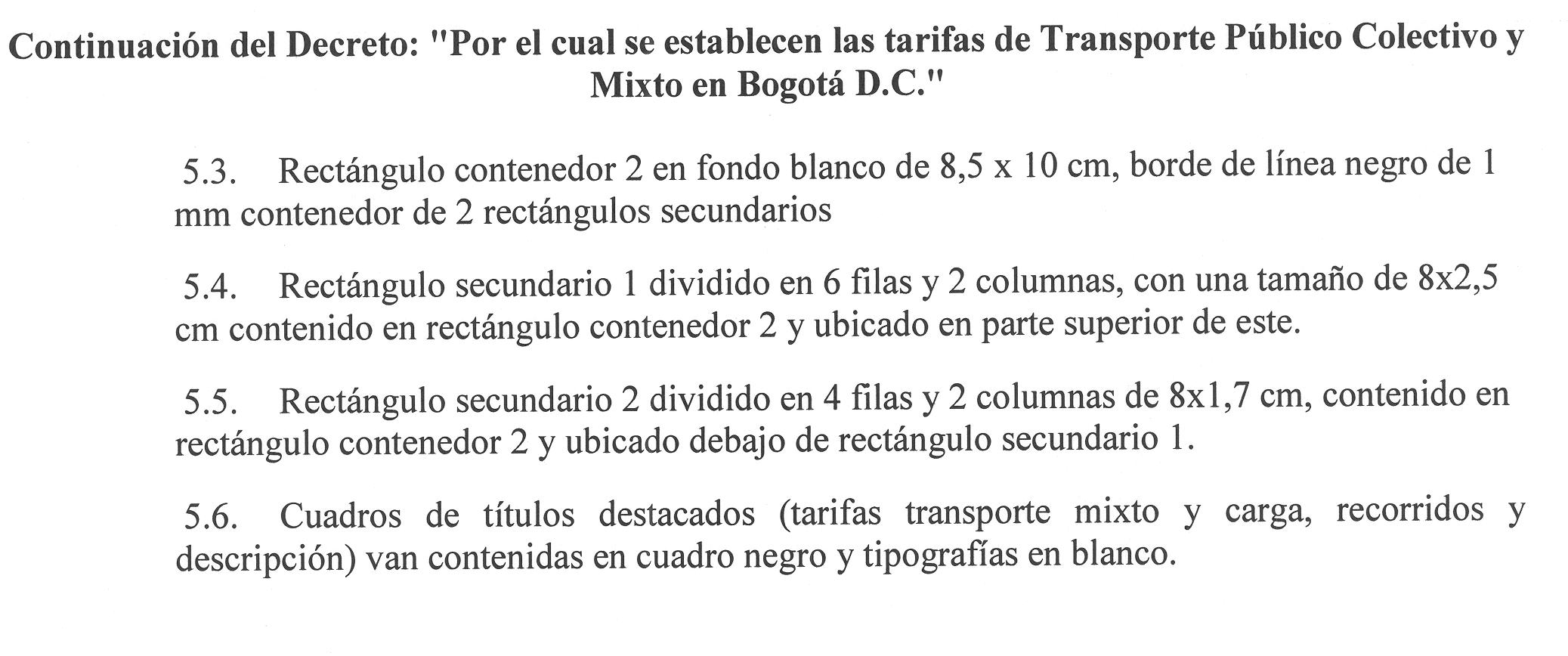 ARTÍCULO TERCERO. Para el cobro de las tarifas autorizadas, es requisito indispensable que los vehículos porten la calcomanía correspondiente a los nuevos valores, la cual será suministrada por las empresas y cuyas especificaciones técnicas figuran en el anexo del presente Decreto.