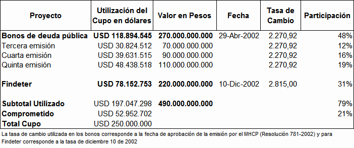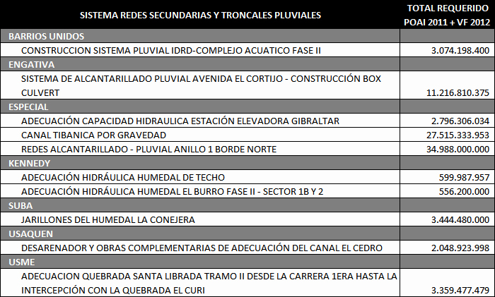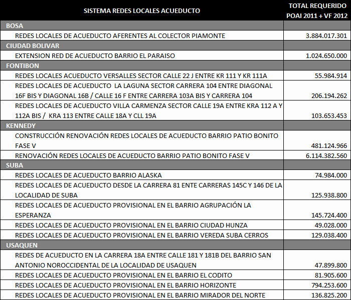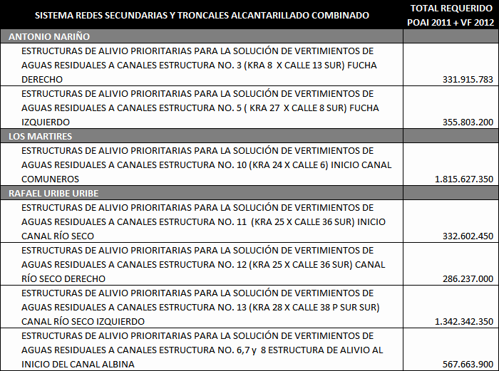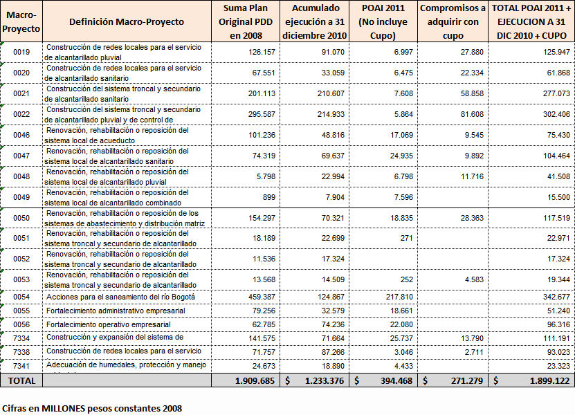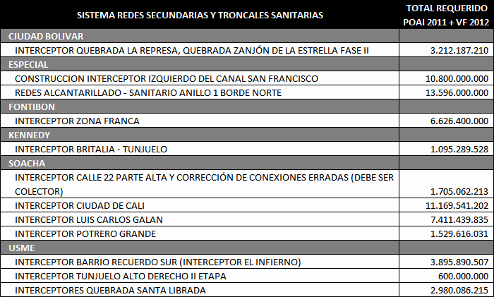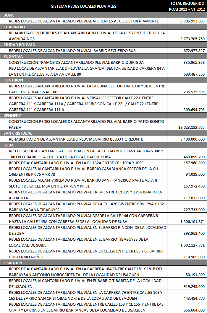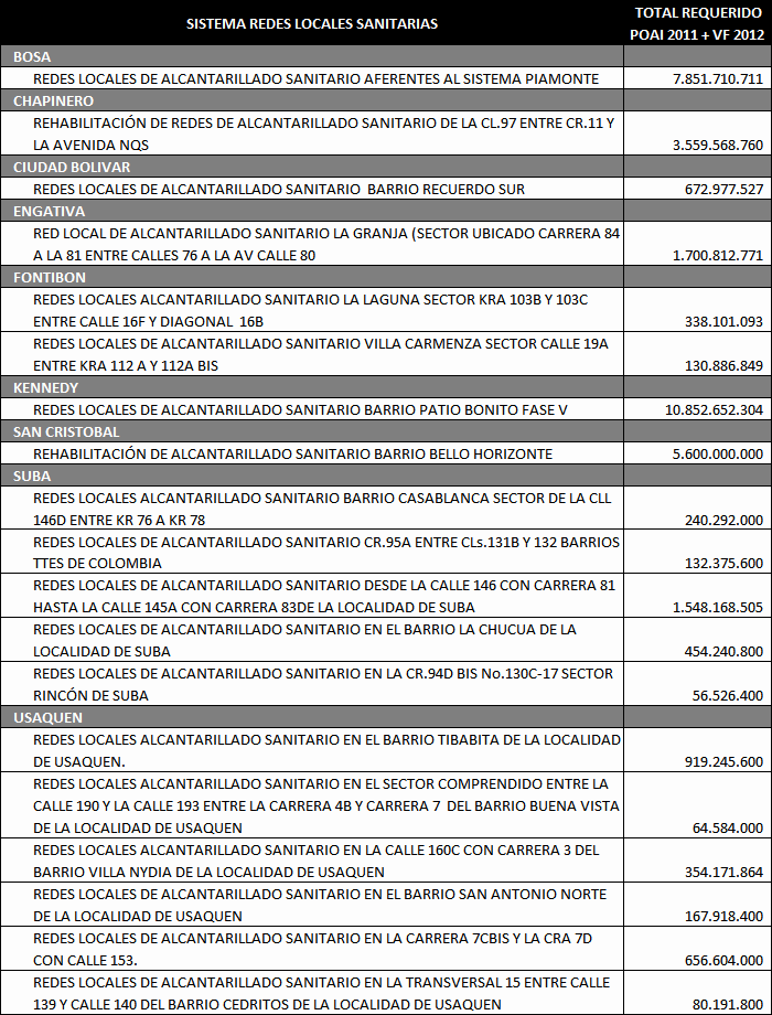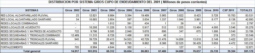 Los principales Proyectos beneficiados por esta primera solicitud de cupo de endeudamiento se enuncian a continuación de acuerdo al Sistema de la Cadena de Valor de Acueducto y Alcantarillado y tipo de inversión: Construcción de Redes Locales para el servicio de Alcantarillado Sanitario y Alcantarillado pluvial: Estos proyectos estuvieron relacionados con la Expansión del Sistema de Alcantarillado Sanitario y Alcantarillado Pluvial local, mediante obras nuevas o complementarias. Dentro de este grupo tenemos proyectos como: Redes locales de Alcantarillado Sanitario en la localidad de Ciudad Bolívar; Redes locales Alcantarillado Pluvial en la localidad de Suba en los Barrios (Bilbao I y II Santa Isabel, el Cedro, el Naranjal, el Pino, Gilmar, Cantalejo, la Gaitana, los Arrayanes, Santa Rita, Villa Gloria, Villa de las Flores); Redes locales de Alcantarillado Pluvial en la Localidad de Rafael Uribe; Redes locales de Alcantarillado Pluvial Calle 22 (Palestina, Torcoroma, Jordán, Boston, Belen, Saturno, Laredo, San Cipriano y Villemar); Redes Locales Alcantarillado Pluvial en la localidad de Fontibón Colector Ferrocarril; Redes locales Alcantarillado Sanitario en la localidad de Bosa Sectores Santa Isabel y el Porvenir; Redes Locales de Alcantarillado Pluvial Sector Fontibón Occidental; Redes Locales de alcantarillado Pluvial Fontibón Oriental, Redes Locales Alcantarillado Sanitario Ciudad Bolívar. Construcción del Sistema Troncal y Secundario de Alcantarillado Pluvial y de Control de inundaciones: Estos proyectos estuvieron relacionados con la Expansión del sistema troncal y secundario de Alcantarillado Pluvial de la ciudad. Los principales proyectos que hacían parte de esta agrupación son: Adecuación Sistema de Drenaje Río Tunjuelo - Presa Cantarrana; Dragado y Realce de Jarillones Río Tunjuelo I Etapa; la fase III del Colector Tibanica Bombeo; la Adecuación Hidráulica de la Quebrada Chiguaza; el Sistema Tintal Norte; el Colector de la Calle 22; el Sistema de Fontibón Occidental; el Sistema de Alcantarillado de Agrológicas y el Box-Coulvert Sistema Salitre. Construcción del Sistema Troncal y Secundario de Alcantarillado Sanitario: Estos proyectos estuvieron relacionados con la Expansión del sistema troncal y secundario de Alcantarillado Sanitario de la ciudad. Los principales Proyectos que hacen parte de esta agrupación son: La Construcción de los Interceptores Tunjuelo Bajo Izquierdo; Tunjuelo Medio segunda Etapa, Tunjuelo Alto Derecho primera y segunda etapa, Interceptor Engativa Cortijo, Optimización del Sistema de alcantarillado troncal aguas abajo de la Avenida 68. Renovación, Rehabilitación o Reposición de los Sistemas locales de Acueducto y Alcantarillado Sanitario: Dentro de este grupo estuvieron la Rehabilitación de las Redes Locales de Alcantarillado Sanitario Barrios Patio Bonito y La Granja, la Rehabilitación de las Redes Locales de Acueducto en los Barrios Pablo Sexto, Bachue, Garcés Navas, Estradita y Estrada. Renovación, Rehabilitación o Reposición de los Sistemas de Abastecimiento y Distribución Matriz de acueducto: Dentro de este grupo estuvieron los proyectos: Optimización integral de la Planta de tratamiento Francisco Wiesner, la Rehabilitación Operación Línea Tibitoc-Usaquen, Rehabilitación Túneles Sistema Chingaza, Rehabilitación Túnel de Usaquen - Santa Bárbara. Renovación, Rehabilitación o Reposición del Sistema Troncal y Secundario de Alcantarillado Sanitario y Pluvial: Dentro de este grupo estuvieron proyectos como: Rehabilitación alcantarillado Galerías y Adecuación Canal Salitre entre calle 45 y Avenida 68; Obras de Reposición y Renovación de redes de acueducto en hierro fundido, galvanizado o asbesto cemento por tuberías plásticas de pvc o polietileno Barrios Gorgonzola, Ejido, Primero de Mayo y Autopista Sur. Adecuación de Humedales, Protección y Manejo Ambiental: Estos proyectos cuyo objetivo principal está asociado a proteger, mantener, mejorar u optimizar las condiciones ambientales de la estructura ecológica principal (definida en el POT) o de cualquier otro elemento natural en donde la EAAB intervenga como resultado de procesos propios del servicio, por disposición legal, convenio interinstitucional o iniciativa propia, mediante obras nuevas o complementarias. Dentro de este grupo estuvieron: Adecuación Hidráulica Humedal Jaboque, Adecuación Hidráulica Humedal La Conejera, Adecuación Hidráulica Humedal La Vaca, Adecuación Hidráulica Humedal Tibanica, Adecuación Hidráulica Humedal Torca, Adecuación Hidráulica Humedal Juan Amarillo. De otra parte las cuentas por pagar 2011 asociadas a la terminación de la ejecución del cupo de endeudamiento anterior del año 2001 ascienden a un valor de $39.384 millones de pesos corrientes, comprometidos principalmente en los siguientes proyectos de inversión: Adecuación Sistema De Drenaje Río Tunjuelo; Interceptor Tunjuelo Bajo izquierdo y Interceptor Tunjuelo Alto Derecho Segunda Etapa. Redes locales de Alcantarillado Pluvial Barrios La Granja, Patio Bonito Fase IV, Parque Distrital Salitre - IDRD - Complejo acuático de la av. cl.63 con cra. 47, San Pablo II Sector, José María Carbonell y San Pedro en Bosa, Casablanca Sector El Pinar, Perpetuo Socorro. Redes locales de Alcantarillado Sanitario Barrios La Granja Fase III (Desde Cra.81 a Cra.76 entre Cl.76 a Av. Cl.80), Patio Bonito Fase IV. Rehabilitación Redes Alcantarillado Sanitario de la Calle 94 entre la Carrera 7 y la Autopista Norte, la Renovación de las Redes locales de Acueducto Barrio Patio Bonito Fase IV. En la Distribución Matriz la Variante Línea Vitelma – Jalisco, la Línea Kennedy Prolongación Av. Tintal 16", Alternativa alimentación a Suba Sector S-5, Interconexión Villa Alsacia Oriental. 3. Operaciones de crédito público ejecutadas con cargo al cupo de endeudamiento del Acuerdo 40 de 2001 En el siguiente cuadro se detallan las operaciones de crédito adelantadas para u