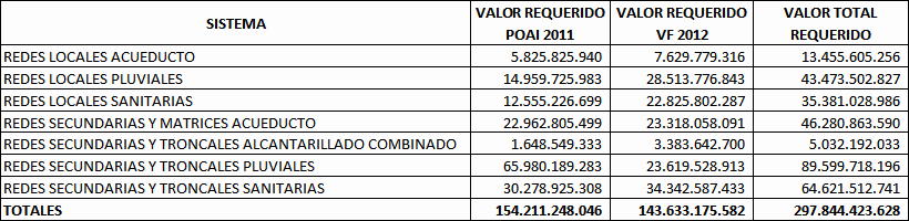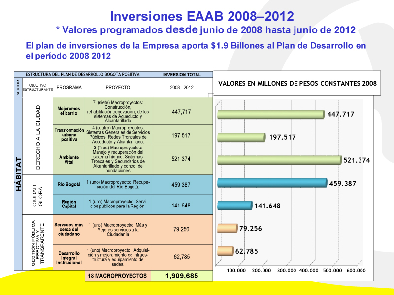 Junto con el avance en el Plan de Desarrollo, la dinámica de visión del desarrollo integral de la ciudad ha conducido a la identificación de proyectos prioritarios, en los que la participación de la Empresa es estratégica con inversiones que aseguren la adecuada prestación de los servicios de agua potable, saneamiento básico y alcantarillado pluvial, en un entorno de crecimiento y modernización, renovación y redensificación urbana, así como de una mayor exigencia y compromiso, sostenibilidad ambiental de la ciudad y la región. Así, los procesos de expansión y re-densificación que vive Bogotá junto con el deterioro normal de las redes existentes, crean la necesidad de programar inversiones en expansión y rehabilitación de redes que demandan recursos de capital. La proyección de ingresos con que se hicieron las programaciones de inversiones con una tasa de crecimiento de las tarifas del 4.5%. Esta proyección no se ha dado pues la inflación ha estado por debajo de las expectativas iniciales, lo cual ha reducido los niveles de ingresos esperados por la empresa para financiar los proyectos de inversión. Durante 2010, Bogotá no escapó a la inclemencia del invierno que estuvo influenciado por el fenómeno de la Niña y que afectó a todo el territorio colombiano. Este año fue el más lluvioso de los últimos 40 años. La ciudad resistió fuertes aguaceros, que en muchos días superó hasta en un 100 por ciento los promedios históricos. Sin embargo, y gracias al Plan Preventivo de Invierno y a las obras de ingeniería adelantadas por la Administración Distrital, se logró disminuir en la capital del país el impacto de las inundaciones en lo que tiene que ver con afectación a predios y damnificados. Así mismo, el gobierno nacional ante el fuerte invierno que se presenta en el país y en el Distrito Capital tomó medidas excepcionales para convocar el Estado de Emergencia Económica, Social y Ecológica por razón de grave calamidad pública, para lo cual expidió normas tendientes a conjurar la situación. Previo a la entrada de la segunda temporada de invierno, el Acueducto de Bogotá intensificó sus rutinas de mantenimientos y monitoreo de los 8 mil 900 kilómetros de redes de alcantarillado y 252 kilómetros de quebradas y canales. La Empresa también hizo intervención en los sumideros afectados por el arrojo de basuras y escombros. Las labores preventivas en el alcantarillado fueron realizados por los Escuadrones de Invierno del Acueducto de Bogotá, integrados por más de 334 operarios equipados con 22 equipos de succión-presión (Vactor), 18 equipos de varilla y sondeo, equipo cabrestante, 37 volquetas, 13 retroexcavadoras y cargadores, minicargadores, 34 motobombas y paladragas y cinco robots. Simultáneamente, se adelantó una campaña pedagógica denominada "Bogotano prevenido, evita inundaciones" con el que se buscó que los ciudadanos cuiden el sistema de alcantarillado y eviten botarles basuras y escombros. En lo que tiene que ver con obras de ingeniería para el control de inundaciones, la ciudad avanzó con varios proyectos, como la canalización del río Fucha que permitió recoger las lluvias del centro y occidente de la ciudad evitando que se presentaran las tradicionales inundaciones en sectores de Fontibón y Kennedy, beneficiando a más de 3 millones de habitantes. También terminó el box coulvert del Humedal Córdoba que mitigó inundaciones en el sector de Suba y se avanzó en la rehabilitación de los alcantarillados de la calle 92, 94, y en sectores de Bosa, Kennedy, Tunjuelito y Ciudad Bolívar. Los efectos que está trayendo el cambio climático han obligado a muchos gobiernos en el mundo y a las comunidades a buscar mecanismos para mitigar y adaptar sus entornos a esta nueva realidad global. La problemática de fenómenos hidrometeorológicos como inundaciones, crecientes y avalanchas entre otros, nos debe lleva a repensar y readaptar la ciudad. Bogotá no debe ser ajena a esta nueva dinámica que deja el clima. Es así como en temas de desagües y drenajes la ciudad no debe aplazar los proyectos que permitan ampliar las capacidades y rehabilitar sus sistemas de alcantarillados. También es necesario que en los nuevos proyectos viales, así como en los sectores de expansión y de redensificación de la ciudad se incluya simultáneamente todo un programa de obras de drenaje que le permitan a la ciudad en el futuro enfrentar las grandes lluvias y tormentas que seguirá trayendo el disfuncionamiento del clima. Las obras clasificadas como expansión y rehabilitación de redes se enmarcan dentro de los objetivos estructurantes a) "Derecho a la Ciudad" en los programas "Mejoremos el Barrio" y "Ciudad Vital" y b) "Ciudad Global" dentro del programa "Región Capital". A la fecha la EAAB, ha ejecutado los diferentes proyectos comprendidos en los referidos programas de acuerdo a sus programaciones, obteniendo los siguientes indicadores de cumplimiento: * 99.89% en cobertura acueducto * 99.15% en cobertura Alcantarillado Sanitario * 99.4% en cobertura Alcantarillado Pluvial * 99.81% en relación a la calidad del servicio * 99.66% en relación a la continuidad en la prestación del servicio La ejecución de estos proyectos han generado los siguientes impactos en la ciudad: * Mejoramiento en la calidad de vida de los usuarios * Generación de externalidades que permiten la reducción de las enfermedades y la Mortalidad infantil causada por ingerir agua contaminada. * Evitar la transmisión de enfermedades que se pueden producir por la escorrentía superficial de aguas residuales o malas conexiones a otros cuerpos hídricos. * Control de inundaciones que se presentan en los barrios en la época invernal. * Cumplimiento con los más altos índices de las normas nacionales e internacionales de calidad de agua lo que beneficia altamente a toda la población. * Prestación de un servicio de alta calidad para la ciudadanía, como consecuencia de un énfas