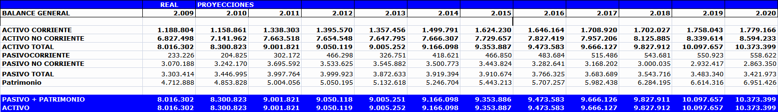 5.3 Análisis del Endeudamiento de la EAAB-ESP – Nuevo Cupo de Endeudamiento La EAAB-ESP propenderá por obtener oportunamente los recursos del crédito contemplados en el plan financiero en las mejores condiciones de costo y plazo y continuará con la política de mejora continua del perfil de endeudamiento. Así, con el fin de contar con una estructura de financiamiento acorde con las condiciones financieras del mercado en los momentos de consecución de recursos, se buscará alargar la vida media del portafolio del pasivo financiero y definir vencimientos graduales que no generen una fuerte presión sobre los presupuestos anuales, de tal modo que los indicadores de endeudamiento cumplan con el objetivo de mantener la mejor calificación de riesgo crediticio. Por otra parte, dentro de la estrategia de endeudamiento se utilizarán operaciones de manejo de los riesgos contemplados en las políticas internas de la Empresa, que dan el marco de referencia para la administración del portafolio de deuda, buscando minimizar la incertidumbre y la incidencia de las variables macroeconómicas en el servicio de la deuda. Tal y como se presenta dentro de la estrategia financiera, se requiere contar con financiación proveniente de recursos del crédito por la suma equivalente en pesos de $300.000.000.000. De otra parte, para optimizar la planeación financiera y el manejo de los riesgos implícitos en las operaciones de crédito, dentro de la estrategia de financiamiento se tiene contemplada la ejecución de operaciones de manejo de la deuda pública, reduciendo así la exposición de la deuda ante riesgos financieros. 5.4 Análisis de la Capacidad de Endeudamiento Mediante la Aplicación de Indicadores Financieros A continuación se realiza un análisis de los estados financieros (Balance General, Estado de Actividad Financiera, Económica y Social y Flujo de Caja. 5.4.1 Balance General La Empresa mantiene un nivel de endeudamiento razonable (total de pasivos frente al total de activos) del 41.5%, 44.4% y 44.2% para los años 2010-2011-2012 respectivamente (Cuadro 4), disminuyendo proporcionalmente en el 2% anual hasta situarse en el año 2020 en el 33%. El promedio de este indicador para los años 2010-2020 es de 39.92%. Si por otra parte analizamos las obligaciones financieras en relación con los activos totales, podemos apreciar que estas disminuyen como porcentaje del activo total, al pasar de representar un 6.3% en el 2010 a 2.1% en el 2020. Durante los años de análisis, el mayor porcentaje de las obligaciones financieras sobre el activo total se observa en el año 2011 con el 11.2% y en el año 2012 con el 10.3%, periodos en los cuales se efectúa la obtención del financiamiento del nuevo cupo de crédito asignado (Cuadro 1). Cuadro No. 1 BALANCE GENERAL (MILLONES DE PESOS)
