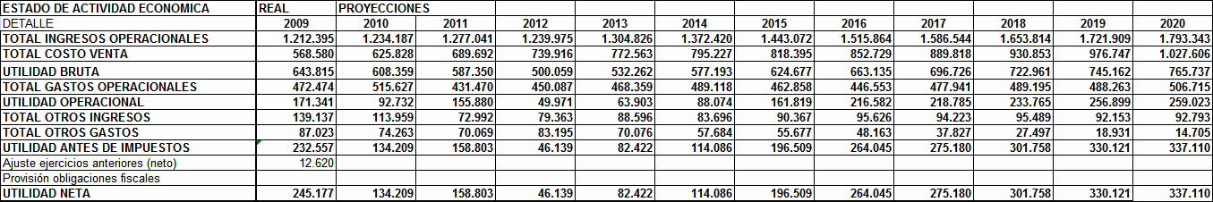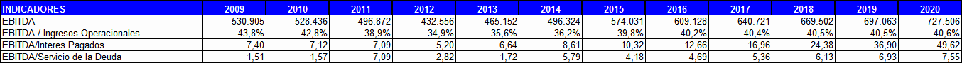 Fuente: Empresa de Acueducto y Alcantarillado de Bogotá -ESP- - Cálculos: Gerencia Financiera EAAB-ESP 5.4.2 Estado de Actividad Económica La cobertura de intereses y servicio de la deuda en el año 2009 tomando como fuente el EBITDA, fue de 7.40 y 1.51 veces. Lo anterior permite afirmar que la EAAB - ESP posee una utilidad operacional de caja suficiente para cubrir periódicamente las necesidades de caja de la deuda actual y el endeudamiento adicional. Esto lo podemos observar en el cuadro adjunto en el cual se ve claramente el impacto de las nuevas medidas adoptadas por la EAAB-ESP con el fin de llevar a cabo sus políticas de inversión encaminadas a ampliar y mejorar la infraestructura actualmente existente. Al analizar el comportamiento de cobertura de los intereses y del servicio de la deuda en las proyecciones financieras se observa el impacto de las acciones para reestructurar la deuda, llevadas a cabo en el año 2010 que consistió en mejorar las tasas de interés y los plazos (a 12 años con un periodo de gracia de tres años). Es importante resaltar que a pesar de la disminución de los ingresos por el cambio de tarifas, la cobertura de estos indicadores desde el punto de vista operacional no afecta la capacidad de pago lo que le permite a la EAAB-ESP mantenerse en niveles similares a años anteriores sin detrimento en las utilidades, con unos niveles de apalancamiento tanto del activo como del patrimonio acordes con el crecimiento esperado (Ver Cuadro No 2.Indicadores financieros.) El cambio en la estructura financiera permite igualmente minimizar el impacto de los costos financieros y suavizar el servicio de la deuda al aumentar el periodo de amortización en el tiempo, igualmente la regulación de los ingresos, costos y gastos a partir del 2013 permite mejorar el EBITDA mostrando un comportamiento uniforme del 40% hasta el 2020 (Ver Cuadro No 2). Cuadro No. 2 ESTADO DE ACTIVIDAD ECONÓMICA (Millones de pesos)