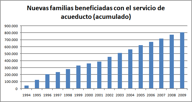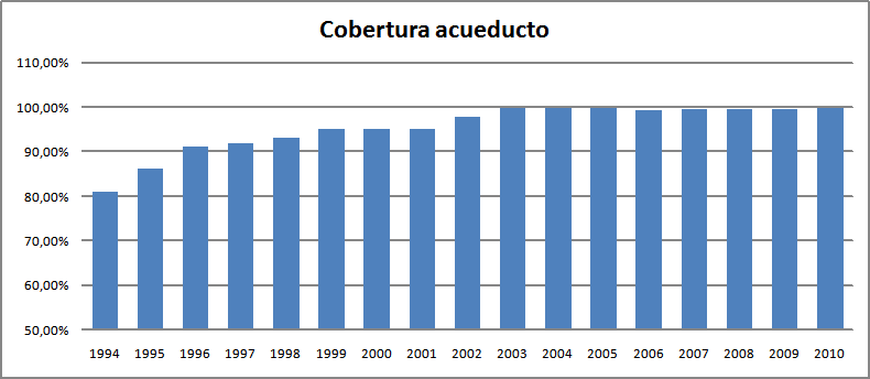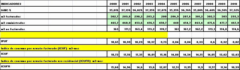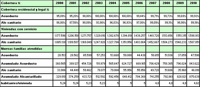 En desarrollo de lo explicado anteriormente y acorde con los indicadores básicos formulados para el sector de acueducto y alcantarillado dentro de los objetivos del Plan de Ordenamiento Territorial, el Plan de Desarrollo Distrital "Bogotá Positiva: para Vivir mejor" y dentro del Plan de Gestión y Resultados establecidos por la Comisión Reguladora de Agua Potable para la evaluación de las empresas por parte de la Superintendencia de Servicios Públicos, la Empresa, presenta a continuación los indicadores de gestión obtenidos durante el periodo 2000-2010. Indicadores de cobertura