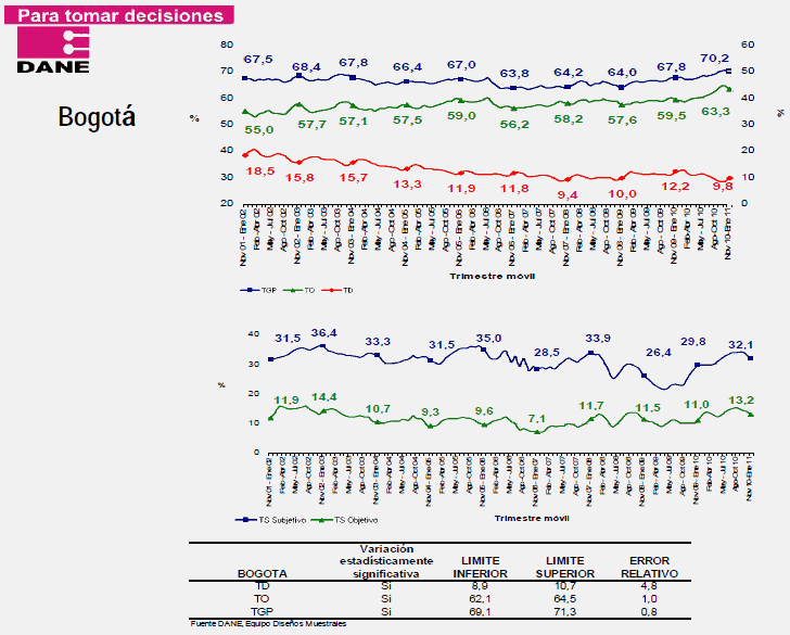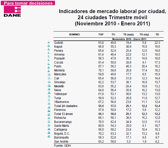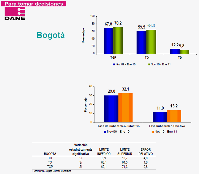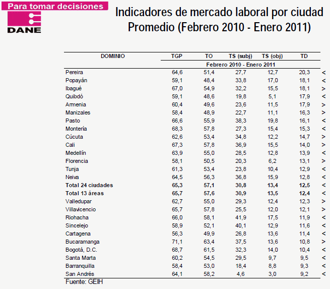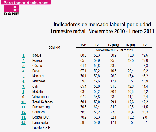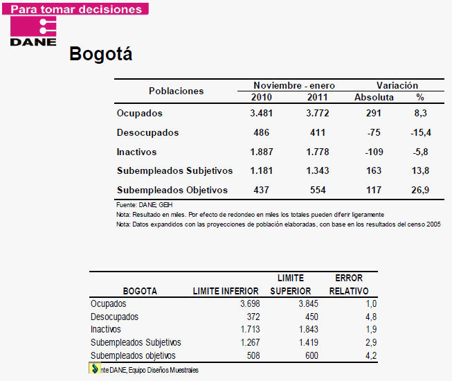 Jorge Bustamante, director del Dane, dijo que con las cifras se confirma la tendencia a la baja del desempleo. Por su parte, señala el Dane, los ocupados fueron 18'932.000 en enero de este año, que son 655.000 personas más que en enero del año pasado. En el primer mes del 2011, en las 13 áreas metropolitanas, el desempleo fue 14,7 por ciento, frente a 15,3 de igual mes del 2010.