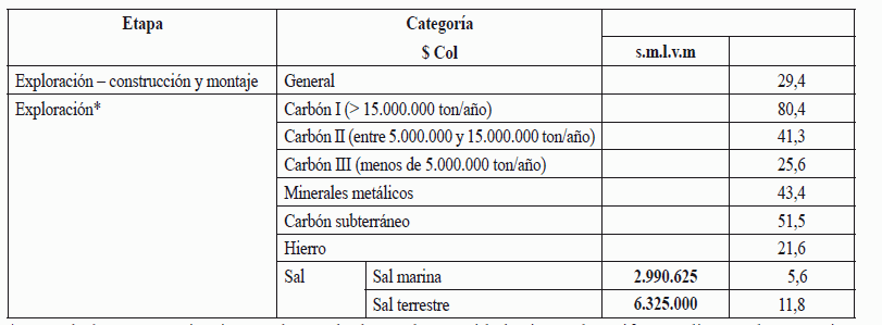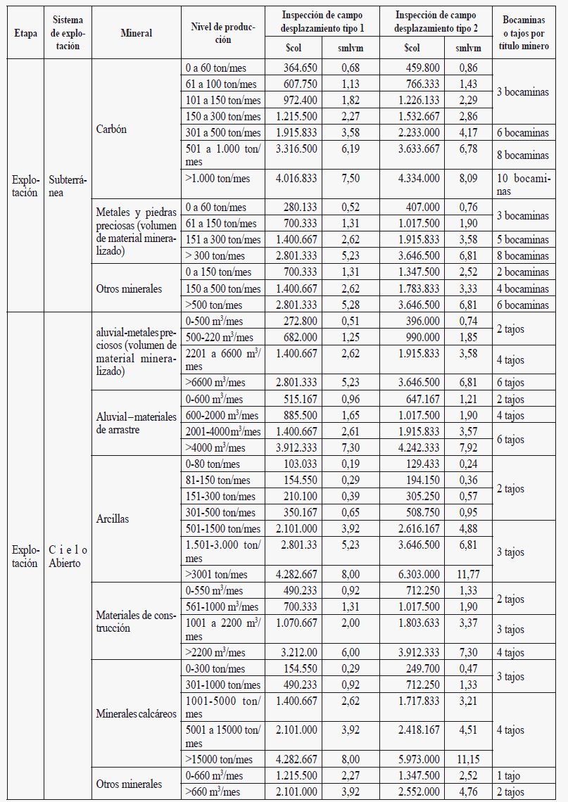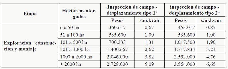 * Desplazamiento tipo 1: es el que solamente involucra transporte terrestre. * Desplazamiento tipo 2: es el que involucra además de transporte terrestre el aéreo, fluvial o la combinación de estos TABLA NÚMERO 2 Tarifas de inspección, seguimiento y control: etapa de explotación