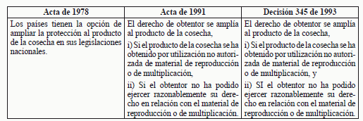 El Acta de 1991 y la Decisión 345 proporciona en consecuencia al obtentor un derecho ejercible sobre el producto de la cosecha, pero únicamente en la medida necesaria para abordar los problemas que habían surgido en la práctica.