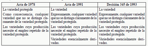 En virtud del Acta de 1978, el derecho de obtentor se ampliaba a la variedad protegida y, en consecuencia, a cualquier variedad que no pudiera distinguirse claramente de la variedad protegida. Se ampliaba asimismo a cualquier variedad producida comercialmente por el empleo repetido de la variedad protegida (es decir, a cualquier variedad híbrida F1 producida utilizando la variedad protegida como progenitor). En virtud del Acta de 1991, el derecho de obtentor se amplía hasta abarcar las variedades "esencialmente derivadas" de la variedad protegida esto también lo contempla la Decisión 345.