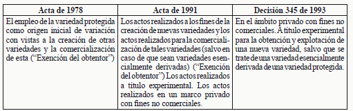 Las Actas de 1978 y 1991 especifican determinadas excepciones obligatorias al derecho del obtentor en la forma siguiente: