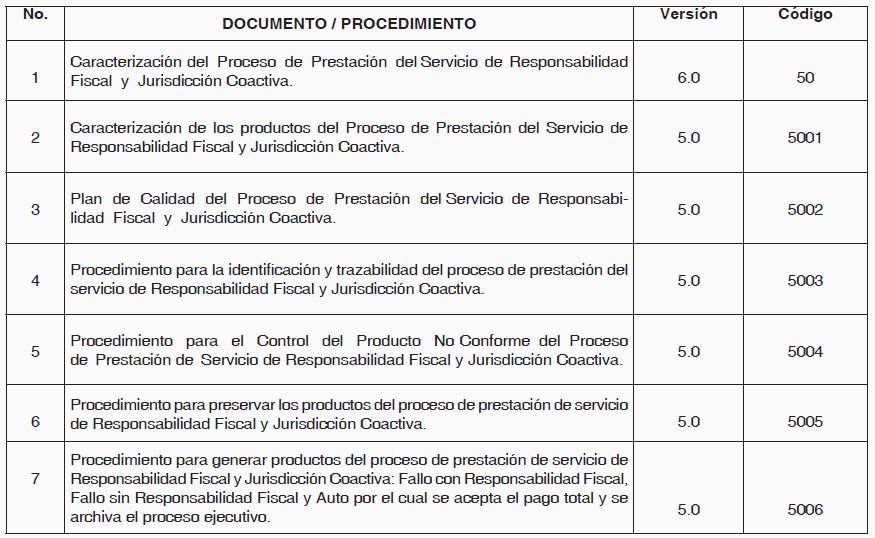 RESOLUCIÓN REGLAMENTARIA 024 DE 2010 (Octubre 26) Derogada por el art. 9, Resolución Contraloría Distrital 041 de 2013. "Por la cual se modifican los documentos y procedimientos del Proceso de Prestación de Servicio de Responsabilidad Fiscal y Jurisdicción Coactiva de la Contraloría de Bogotá D.C." EL CONTRALOR DE BOGOTÁ D. C. En ejercicio de sus atribuciones legales y en especial las que le confiere el Acuerdo 361 de enero 6 de 2009; y CONSIDERANDO: Que de conformidad con los literales b) y l) del artículo 4 de la Ley 87 de 1993 "Por la cual se establecen normas para el ejercicio de control interno en las entidades y organismos del Estado y se dictan otras disposiciones", se deben implementar como elementos del sistema de control interno institucional la definición de políticas como guías de acción y procedimientos para la ejecución de procesos, así como, la simplificación y actualización de normas y procedimientos.Que el artículo 6 del Acuerdo 361 de enero 6 de 2009 del Concejo de Bogotá, D.C., consagra la "Autonomía administrativa. En ejercicio de su autonomía administrativa le corresponde a la Contraloría de Bogotá, D.C., definir todos los aspectos relacionados con el cumplimiento de su funciones en armonía con los principios consagrados en la Constitución, las leyes y en este Acuerdo." Que de conformidad con el artículo 52 del citado Acuerdo, corresponde a la Dirección de Responsabilidad Fiscal y Jurisdicción Coactiva "definir las políticas e impartir las directrices generales sobre indagaciones preliminares y procesos de responsabilidad fiscal y jurisdicción coactiva que debe desarrollar la Contraloría de Bogotá, D.C.". Que el numeral 9 del artículo 37 ibídem, consagra como una de las funciones de la Dirección de Planeación, "Realizar la revisión técnica de los planes, documentos y procedimientos que adopte la entidad, para asegurar la armonización, implementación y evaluación de los mismos" Que el Modelo Estándar de Control Interno MECI, adoptado en la Contraloría de Bogotá mediante la Resolución Reglamentaria No. 013 de 12 de junio de 2006, contiene entre otros elementos de control del Subsistema de Control de Gestión, los procedimientos conformados por el conjunto de especificaciones, relaciones y ordenamiento de tareas requeridas para cumplir con las actividades de un proceso controlando acciones que requiere la operación de la Contraloría de Bogotá D.C., y el Manual de procedimientos como una guía de uso individual y colectivo que permite el conocimiento de la forma como se ejecuta o desarrolla su función administrativa, propiciando la realización del trabajo bajo un lenguaje común a todos los servidores públicos. Que los instrumentos de medición de la gestión y resultados desarrollados al interior de la Contraloría de Bogota D.C., como: el Plan de Actividades y Sistema de Medición de la Contraloría de Bogotá, D.C., fueron sustituidos por el Plan de Acción mediante Resolución Reglamentaria 025 de octubre 23 de 2009. Que el gobierno nacional promulgó la Ley 1066 de 2006 para la normalización de la cartera pública, estableciendo para todas las entidades públicas que de manera permanente tiene a su cargo el recaudo de rentas o caudales públicos, la obligación de expedir un reglamento interno para el recaudo de cartera. Que así mismo, el gobierno nacional reglamentó la Ley 1066 de 2006, mediante el Decreto 4473 de diciembre 15 de 2006, el cual ordena al representante legal de las entidades cobijadas por aquella norma expedir su propio reglamento interno de recaudo de cartera en los términos allí señalados, obligación que la Contraloría de Bogotá cumplió mediante la expedición de la Resolución 019 de 10 de diciembre de 2008, modificada por la Resolución Reglamentaria 020 del 9 de agosto de 2010. Que mediante Resolución Reglamentaría No. 016 de 2008, se adoptó la caracterización de los procesos del Sistema de Gestión de Calidad de la Contraloría de Bogotá. Que la Contraloría de Bogotá expidió la Resolución Reglamentaría No. 005 de 2008, "Por la cual se modifican los documentos y procedimientos del Proceso de Prestación de Servicio de Responsabilidad Fiscal y Jurisdicción Coactiva de la Contraloría de Bogotá D. C.". Que mediante Resolución Reglamentaria 011 del 12 de abril de 2010 se asignaron competencias para el trámite de los procesos de responsabilidad fiscal y de jurisdicción coactiva. Que las normas de calidad NTCGP 1000:2009 y NTC ISO 9001:2008, establecen el enfoque por procesos y en desarrollo del concepto de mejora contemplado en éstas normas los documentos y procedimientos adoptados en las citadas resoluciones, deben ser modificados parcial o totalmente. En mérito de lo expuesto, RESUELVE: ARTÍCULO PRIMERO.- Adoptar la nueva versión de los siguientes Documentos y Procedimientos del Proceso de Prestación de Servicio de Responsabilidad Fiscal y Jurisdicción Coactiva de la Contraloría de Bogotá, D.C.