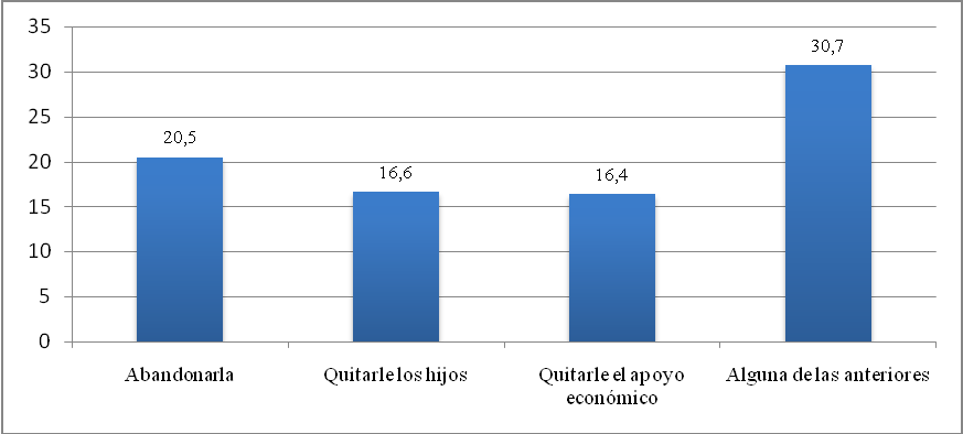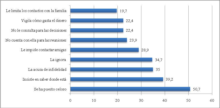 Fuente: Encuesta de Demografía y Salud (2010) ii) Violencia verbal: Se asocia con insultos o expresiones descalificadoras o intentos de control contra la mujer. Específicamente la ENDS (2010) pregunta, por un lado, sobre los aspectos relacionados con el control posesivo por parte de los conyugues o parejas, y por otra parte, indaga los tipos de trato que reciben por parte de sus parejas; por ejemplo decirle "usted no sirve para nada", "usted nunca puede hacer nada bien", "usted es un bruta" y "mi mamá me hacía mejor las cosas". En el gráfico 2 se muestran las situaciones de control del esposo o compañero más frecuentes de la siguiente manera: celos 50,7%, insistencia en saber dónde están 39,2% y, finalmente, el 35% la acusa de infidelidad. Gráfico 2. Porcentaje de mujeres bogotanas que experimentaron situaciones de control por parte del esposo o compañero 2010