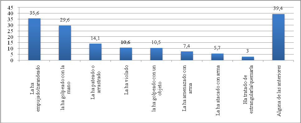 Fuente: Encuesta de Demografía y Salud (2010). iii) Violencia física: Son actos que agreden o atentan contra el cuerpo de la otra persona. Los datos de la ENDS del 2010, muestran que el 39,4% de las mujeres bogotanas dijo haber sufrido algún tipo de violencia física. Gráfico 3. Porcentaje de mujeres bogotanas que sufrió violencia física