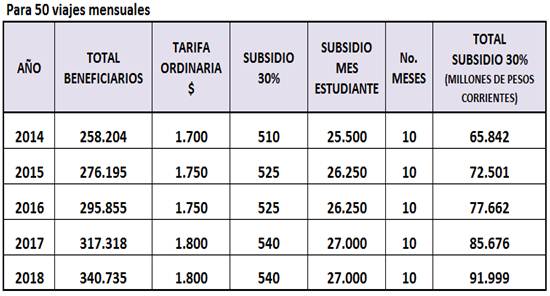 Costo de la tarifa diferencial para el año 2014 y subsiguientes: Sabiendo que el monto de la Tarifa Estudiantil propuesta tiene un valor máximo equivalente al 70% de la tarifa ordinaria, es decir que hay una reducción en el valor del pasaje mínima del 30%, con un costo de transporte como el actual de $1.700, el descuento sería de $510 y por tanto los estudiantes solo pagarían $1,190. En consecuencia el costo de la reducción en el valor del pasaje, producto de la aplicación de la Tarifa Estudiantil para el 2014 y años subsiguientes con una asignación de hasta cincuenta (50) viajes mensuales durante la vigencia escolar (10 meses), sería: