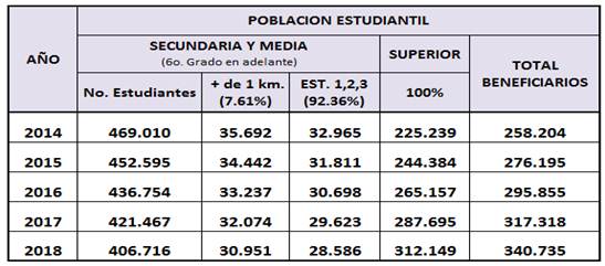 Fuente: Respuesta derecho de petición SED, realizado por UAN 503, radicado E - 2013 – 164613 De acuerdo con la información anterior, sobre un total de 469.010 matriculados a 2014 en los niveles secundaria y media (grados de 6º. en adelante), y teniendo en cuenta que los estudiantes objeto de esta medida son los que residen a más de 1 kilometro de la institución educativa (7.61%), que pertenecen a los estratos 1, 2 y 3 (92.36%), los beneficiarios de la Tarifa Estudiantil son aproximadamente 32.965. * Evolución de la matrícula en el D.C. Vale recalcar que para el año 2013, la matrícula registró 883.177 estudiantes, y para el año 2014, se matricularon 887.057. En tal sentido, de acuerdo con el cuadro anterior, la matrícula en el sector oficial viene disminuyendo año a año en un 3.5% aproximadamente, indicador utilizado para las proyecciones de las vigencias futuras. * Educación Superior (técnica, tecnológica y universitaria) – Sector oficial. En lo que respecta a la educación superior, según datos del Ministerio de Educación Nacional (Oficio dirigido a la Dra. Patricia Buriticá Céspedes, Subsecretaria de Calidad y Pertinencia de la SED, con fecha abril de 2014), se tiene que en la capital de la República, la población estudiantil del sector oficial a 2013 era de 225.239 estudiantes (datos preliminares); en el 2012: 206.621, y en el 2011: 191.471, lo cual evidencia un incremento anual de aproximadamente el 8.5%, coeficiente que se mantiene en general y es utilizado para el cálculo de la población objetivo de este proyecto de acuerdo. Veamos: Proyección de la población estudiantil a atender: