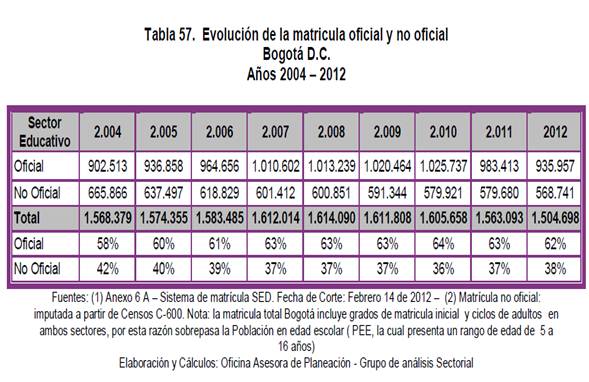 Fuente: Proyecciones de Población del DANE – SDP Elaboración y cálculos: Oficina Asesora de Planeación – SED. Grupo de Análisis Sectorial En la tabla se observa que el número de estudiantes de las instituciones educativas oficiales tiene una tendencia a la baja. * Educación secundaria y media - sector oficial: Según datos oficiales de la SED (Comisión Accidental P.A. 160/14), actualmente hay en Bogotá 887.057 estudiantes entre los niveles desde preescolar hasta media, distribuidos por tipo de colegio como se muestra en el siguiente cuadro: