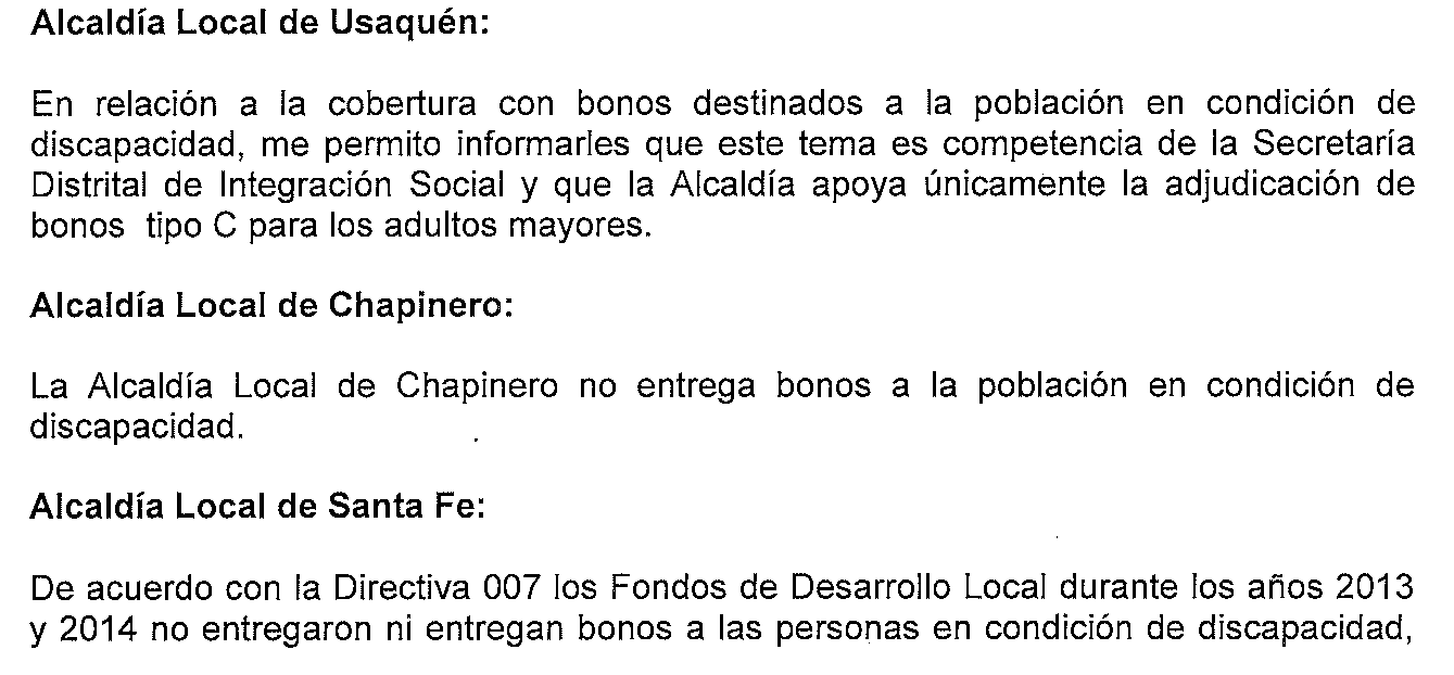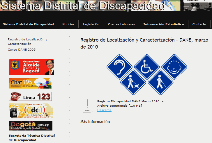 La poca información es casi reservada, incluso al solicitarla desde mi oficina, se planteó que toda debía tramitarse a través de la Secretaría Técnica de Discapacidad y no a través de los consejos locales de discapacidad; otro ejemplo de ello es que incluso dentro de la misma instancia hay dificultad a la hora de facilitar los datos necesarios para el buen funcionamiento del sistema Distrital de Discapacidad
