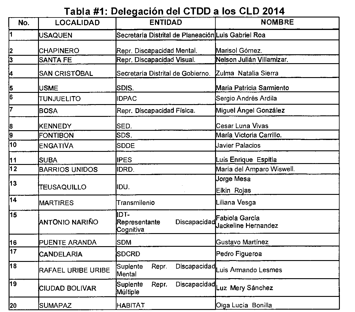 Recordemos que los Consejos Locales de Discapacidad están integrados por: El Alcalde Local o su delegado o delegada, un delegado de un hospital público de primer nivel, un delegado de la Dirección Local de Educación, un delegado de la Subdirección Local para la integración Social, un delegado de la Secretaría Distrital de Cultura, Recreación y Deporte, un delegado de la Secretaría Distrital de Movilidad, un delegado de la Secretaría del Hábitat, un delegado del Instituto para la Economía Social (IPES), un delegado del Instituto Distrital de Participación y Acción Comunal (IDPAC), un delegado del Instituto Distrital de Recreación y Deporte (IDRD), un delegado de la Junta Administradora Local (JAL) y los siete (7) representantes de las personas con limitación y/o discapacidad (física, mental, cognitiva, auditiva, visual múltiple y sordo ceguera).