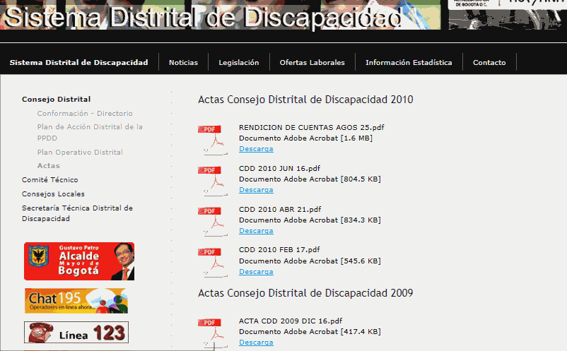 El informe que se radica por parte del SDD al Concejo es el único instrumento de información con el que hoy cuenta para analizar el funcionamiento del Consejo Distrital y Consejo Local. La pagina web como http://sisdiscapacidad.jimdo.com/ está totalmente desactualizada, ejemplo de ellos es que las actas del Consejo Distrital De Discapacidad desde el año 2010 no se vienen subiendo, (Ver figura 1), en información estadística la única que se encuentra es la del DANE, y los comités locales no hay información publica alguna que sirva para construir conocimiento.