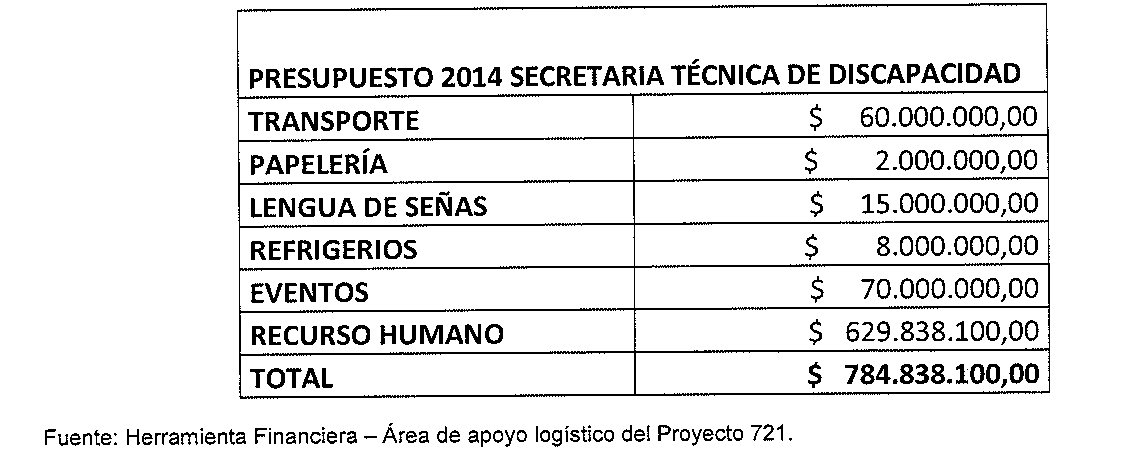El presente proyecto no tiene impacto fiscal, dado que los artículos propuestos no generan gastos adicionales, el Sistema Distrital de Discapacidad cuenta con un presupuesto para el año 2014 de $784.838.100, todo ello contenido dentro de la Secretaría de Integración Social, distribuido conforme a la figura 2.