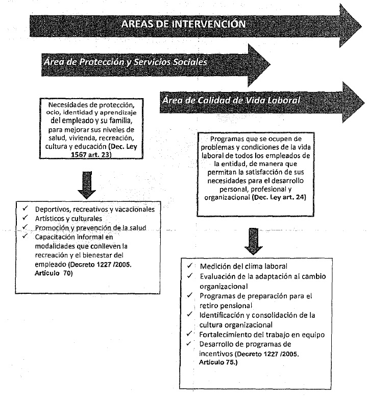 3. Respecto de los Programas de bienestar social e incentivos, el Articulo 18° consagra: "Programas de Bienestar Social e Incentivos. A través de los programas de bienestar social y de los programas de incentivos que formulen y ejecuten las entidades, se pondrá en funcionamiento el sistema de estímulos para los empleados".4. Lo concerniente a la periodicidad de los planes se encuentra consignado el Artículo 19°, "Programas Anuales. Las entidades públicas que se rigen por las disposiciones contenidas en el presente Decreto - ley están en la obligación de organizar anualmente, para sus empleados, programas de bienestar social e incentivos". 5. Para la aplicación de Los Programas de Bienestar Social la norma establece lo siguiente: ''Artículo 22°.- Áreas de Intervención. Para promover una atención integral al empleado y proporcionar su desempeño productivo, los programas de bienestar social que adelanten las entidades públicas deberán enmarcarse dentro del área de protección y servicios sociales y del área de calidad de vida laboral. Articulo 23°.- Área de Protección y Servicios Sociales. En esta área se deben estructurar programas mediante los cuales se atiendan las necesidades de protección, ocio, identidad y aprendizaje del empleado y su familia, para mejorar sus niveles de salud, vivienda, recreación, cultura y educación. Los programas de esta área serán atendidos en forma solidaria y participativa por los organismos especializados de seguridad y previsión Social o por personas naturales o jurídicas, así como por los empleados, con el apoyo y la coordinación de cada entidad. Artículo 24°." Área de Calidad de Vida Laboral. El área de la calidad de vida laboral será atendida a través de programas que se ocupen de problemas y condiciones de la vida laboral de los empleados, de manera que permitan la satisfacción de sus necesidades para él desarrollo personal, profesional y organizacional. Los programas de esta área deben recibir atención prioritaria por parte de las entidades y requieren, para su desarrollo, el apoyo y la activa participación de sus directivos".