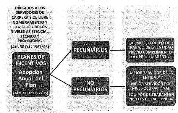 II. ASPECTOS A TENER EN CUENTA A efectos de garantizar una correcta aplicación e, implementación de los Planes de Bienestar, Estímulos e Incentivos, las entidades deberán tener en cuenta como mínimo, las siguientes observaciones: * Los Planes de Bienestar, Estímulos e Incentivos, no podrán limitarse a eventos o actividades aisladas o desarticuladas de las finalidades definidas en la reglamentación vigente en la materia. Esto implica, que los componentes a través de los cuales se desarrollen estos Planes, deberán tener definida su finalidad, identificación de la población beneficiaria, cobertura de la misma e impacto en la calidad de vida laboral. * Es necesario recordar que los planes y programas que establezcan las entidades, no suplirán o reemplazarán las competencias, obligaciones y responsabilidades de las Cajas de Compensación Familiar, EPS's, ARL's y Fondos de Vivienda o Pensionales. * En caso de que la entidad cuente con recursos suficientes que permitan en el marco de los Programas de Bienestar la inclusión de programas educación formal, deberá tenerse en cuenta que estos sólo podrán estar destinados a servidores que ostenten derechos de carrera o que ejerzan empleos de libre nombramiento y remoción, previa acreditación de las condiciones establecidas en el Decreto 1227 de 2005, no resultando procedente que tales programas se financien con cargo al rubro destinado a los Planes Institucionales de Capacitación. * En cuanto al reconocimiento de los mejores servidores de cada nivel y mejor de la entidad, deberá observarse el pleno cumplimiento de los requisitos definidos en el Capítulo IV del Decreto Ley 1567 de 1998 y de manera concordante con las disposiciones contenidas en el Capítulo II del Decreto 1227 de 2005. * Teniendo en cuenta que el propósito de tales reconocimientos conlleva una previa planeación y definición de los incentivos por parte de cada entidad, el Nominador, mediante acto administrativo deberá anualmente, antes de concluido el primer trimestre de cada vigencia, y a partir de la expedición de la presente Directiva, establecer el Plan respectivo, señalando las condiciones que deberán acreditar tanto los servidores de carrera como los de libre nombramiento y remoción, (estos últimos, pertenecientes a los niveles asistencia, técnico y profesional, Art. 30 del Decreto Ley 1567 de 1998). * En el mismo Plan, se establecerán las condiciones para el reconocimiento de los mejores equipos de trabajo y el monto destinado para el otorgamiento del incentivo pecuniario con el que se premiará el mejor equipo de la entidad, y los no pecuniarios aplicables a los demás equipos que resulten seleccionados. Al respecto, se aclara que de tales equipos podrán hacer parte, servidores de diferentes dependencias, su carácter podrá ser interdisciplinario y estar integrado por servidores con derechos de carrera de los diferentes niveles ocupacionales y por empleados de libre nombramiento y remoción, perteneciente a los niveles habilitados en el articulo 30 del Decreto previamente citado. * Los criterios a tener en cuenta tanto para la elaboración de los proyectos a desarrollar por los equipos de trabajo, como los de selección y calificación de los mismos, deberán estar definidos antes de la respectiva convocatoria, enmarcarse dentro de las políticas, objetivos y/o planes institucionales, pudiendo corresponder a procesos estratégicos, misionales, de apoyo y/o de control, a fin de garantizar que los mismos, contribuyan a la mejora de la gestión institucional y excelencia en la prestación de servicios, entre otros aspectos relevantes para la Administración. * Es necesario aclarar, que la reglamentación vigente, no prevé la destinación de recursos públicos para la financiación de los proyectos que adelanten los equipos de trabajo interesados en hacerse participes del proceso de selección de los mejores equipos de trabajo, en el marco de los Planes de Incentivos de la Entidad. * La calificación de los proyectos adelantados por los equipos de trabajo implicará, que los mismos hayan concluido plenamente en el año inmediatamente anterior a la fecha del reconocimiento, que sus resultados estén debidamente documentados, demostrando hechos concretos de su implementación, incidencia o aporte significativo en los productos, servicios o resultados de la entidad y el aporte de cada uno de los integrantes del equipo al logro o cumplimiento del proyecto. Los equipos que no cumplan con estos criterios, deberán ser excluidos del proceso de selección. * En el reglamento que se establezca o en la. adopción del Plan Anual, deberán preverse mecanismos técnicos de desempate, caracterizados por la equidad, objetividad y razonabilidad, para resolver de manera transparente y equitativa las situaciones que pudiesen presentarse, cuando dos o más servidores hubiesen obtenido las más altas calificaciones, producto de la evaluación del desempeño y su resultado se enmarque en el nivel de excelencia o sobresaliente. * Así mismo y como garantía de objetividad en el proceso, si alguno de los integrantes del Comité de Incentivos, pudiese hacer parte de los servidores opcionados dentro de la selección al mejor empleado de la entidad, por nivel ocupacional o por equipos de trabajo, deberá declararse impedido evitando posibles conflictos de intereses, en su reemplazo podrá la administración designar a otro servidor, cuando el impedimento recaiga en uno de sus delegados, si por el contrario, el impedimento es presentado por uno de los integrantes de la Comisión de Personal, ésta determinará su reemplazo. |