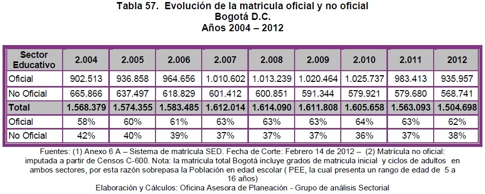 Fuente: Proyecciones de Población del DANE – SDP Elaboración y cálculos: Oficina Asesora de Planeación – SED. Grupo de Análisis Sectorial En la tabla se observa que el número de estudiantes de las instituciones educativas oficiales tiene una tendencia a la baja. *Educación secundaria y media - sector oficial: Según datos oficiales de la SED (Comisión Accidental P.A. 160/14), a 2014, Bogotá contaba con 887.057 estudiantes entre los niveles desde preescolar hasta media, distribuidos por tipo de colegio como se muestra en el siguiente cuadro: