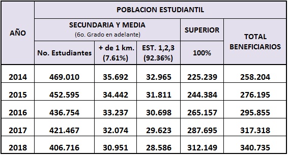 Como los estudiantes objeto de este proyecto de acuerdo son los matriculados en los niveles: secundaria y media (grados de 6º. en adelante), tenemos que a 2014 era: 469.010, cifra base para el cálculo de la población beneficiaria. El resto de los estudiantes, es decir, los matriculados en los niveles: preescolar y básica primaria (de preescolar a grado 5º.), siguen siendo atendidos por el subsidio o ruta escolar que otorga la SED en aplicación del Acuerdo 273 de 2007. * Ubicación del establecimiento educativo con respecto al lugar de residencia Tomando la información suministrada por la SED mediante respuesta a derecho de petición realizado por la UAN 503, radicado E - 2013 – 164613, de un total de 935.957 estudiantes matriculados en el 2012, aproximadamente el 92.39% residen a menos de 1 kilómetro de su lugar de residencia, por lo que su desplazamiento a los centro de educación no implicaría transporte; mientras que el 7.61% corresponde a niños y jóvenes que se encuentran a más de 1 y 2 kilómetros de distancia, coeficiente se mantiene en general y es utilizado para el cálculo de la población objetivo de este proyecto de acuerdo. Veamos: