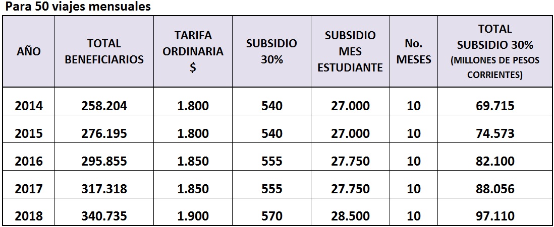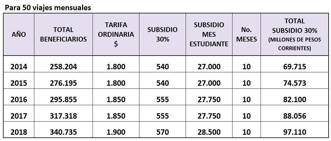 Costo de la tarifa diferencial para el año 2014 y subsiguientes: Sabiendo que el monto de la Tarifa Estudiantil propuesta tiene un valor máximo equivalente al 70% de la tarifa ordinaria, es decir que hay una reducción en el valor del pasaje mínima del 30%, con un costo de transporte como el actual de $1.800, el descuento sería de $540 y por tanto los estudiantes solo pagarían $1,260. En consecuencia el costo de la reducción en el valor del pasaje, producto de la aplicación de la Tarifa Estudiantil en el 2014, y para los años subsiguientes con una asignación de hasta cincuenta (50) viajes mensuales durante la vigencia escolar (10 meses), sería: