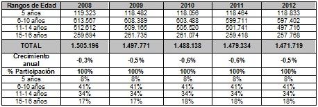 Vale recalcar que para el año 2013, la matrícula registró 883.177 estudiantes, y para el año 2014, se matricularon 887.057. En tal sentido, de acuerdo con el cuadro anterior, la matrícula en el sector oficial viene disminuyendo año a año en un 3.5% aproximadamente, indicador utilizado para las proyecciones de las vigencias futuras. * Educación Superior (técnica, tecnológica y universitaria) – Sector oficial. En lo que respecta a la educación superior, según datos del Ministerio de Educación Nacional (Oficio dirigido a la Dra. Patricia Buriticá Céspedes, Subsecretaria de Calidad y Pertinencia de la SED, con fecha abril de 2014), se tiene que en la capital de la República, la población estudiantil del sector oficial a 2013 era de 225.239 estudiantes (datos preliminares); en el 2012: 206.621, y en el 2011: 191.471, lo cual evidencia un incremento anual de aproximadamente el 8.5%, coeficiente que se mantiene en general y es utilizado para el cálculo de la población objetivo de este proyecto de acuerdo. Veamos: Proyección de la población estudiantil a atender: