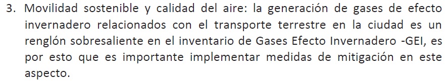Proyecto de Acuerdo No. 167 de 2015 Ver Acuerdo Distrital 619 de 2015 Concejo de Bogotá, D.C. "Por el cual se dictan normas para estimular el uso de vehículos eléctricos como una estrategia para mitigar el cambio climático en el distrito capital" Autor BANCADA POLO DEMOCRATICO ALTERNATIVO Abril 20 de 2015 EXPOSICION DE MOTIVOS 1. OBJETO El objeto del proyecto de acuerdo es establecer unas normas para contribuir al desarrollo de la movilidad sostenible, mitigar los efectos del cambio climático en el distrito capital, reducir los gases de efecto invernadero que genera el transporte, disminuir la contaminación del aire y por ende mejorar su calidad, garantizar los derechos a un ambiente sano y a la salud, reducir los costos en la atención en salud, lo que permitirá liberar recursos para atender otros asuntos de la ciudad; mediante el despliegue de infraestructura de puntos de recarga de vehículos eléctricos tales como automóviles, vehículos de transporte masivo, vehículos de transporte colectivo, vehículos de carga, motocicletas, bicicletas, en el territorio del distrito capital. 2. JUSTIFICACION El crecimiento desaforado de los vehículos en Bogotá, el estado del parque automotor del servicio de transporte colectivo y de los vehículos de Transmilenio que superan en muchos casos la vida útil, genera contaminación del aire con CO2, NOX, emisión de partículas y ruido, lo que se torna insostenible, propiciando graves consecuencias sobre el ambiente, la salud y el presupuesto de la ciudad. En Bogotá, según estudio de la Secretaria de Ambiente, estas son las proyecciones de emisiones de GEI hasta el 2050, donde se advierte un incremento de CO2 hacia el año 2020, 2038 y 2050 sino se toman medidas al respecto.