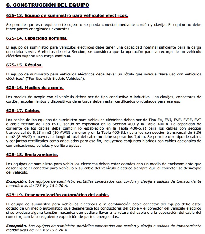 Sentencia C- 595 de 2010 MEDIO AMBIENTE-Protección Esta Corte desde el inicio de sus funciones en el año de 1992, ha denotado la necesidad universalmente reconocida de brindar una respuesta contundente a las intolerables agresiones contra el medio ambiente, como puede apreciarse de la sentencia T-411: La protección al ambiente no es un "amor platónico hacia la madre naturaleza", sino la respuesta a un problema que de seguirse agravando al ritmo presente, acabaría planteando una auténtica cuestión de vida o muerte: la contaminación de los ríos y mares, la progresiva desaparición de la fauna y la flora, la conversión en irrespirable de la atmósfera de muchas grandes ciudades por la polución, la desaparición de la capa de ozono, el efecto invernadero, el ruido, la deforestación, el aumento de la erosión, el uso de productos químicos, los desechos industriales, la lluvia ácida, los melones nucleares, el empobrecimiento de los bancos genéticos del planeta, etc., son cuestiones tan vitales que merecen una decisión firme y unánime de la población mundial. Al fin y al cabo el patrimonio natural de un país, al igual que ocurre con el histórico - artístico, pertenece a las personas que en él viven, pero también a las generaciones venideras, puesto que estamos en la obligación y el desafío de entregar el legado que hemos recibido en condiciones óptimas a nuestros descendientes. MEDIO AMBIENTE-Combinación de deberes contiguo al reconocimiento de derechos Se acepta al medio ambiente sano como un derecho del cual son titulares todas las personas, quienes a su vez se encuentran legitimadas para participar en las decisiones que puedan afectarlo y deben colaborar en su conservación. También como un deber que se le impone a todos y particularmente al Estado: i) proteger su diversidad e integridad, ii) salvaguardar las riquezas naturales de la Nación, iii) conservar las áreas de especial importancia ecológica, iv) fomentar la educación ambiental, v) planificar el manejo y aprovechamiento de los recursos naturales para así garantizar su desarrollo sostenible, su conservación, restauración o sustitución, vi) prevenir y controlar los factores de deterioro ambiental, vii) imponer las sanciones legales y exigir la reparación de los daños causados al ambiente; y viii) cooperar con otras Naciones en la protección de los ecosistemas situados en las zonas de frontera. En suma, el medio ambiente es un bien jurídico constitucionalmente protegido cuya preservación debe procurarse no sólo a través de acciones aisladas del Estado, sino con la concurrencia de los individuos, la sociedad, la empresa y demás autoridades. (subrayado fuera de texto) Normatividad sobre puntos de recarga y vehículos eléctricos en Colombia En Colombia existe el código eléctrico colombiano, Norma técnica Colombiana NTC 2050, en el cual se encuentra una serie de regulaciones sobre los sistemas de recarga de los vehículos eléctricos. A continuación se transcribe los aspectos mas relevantes de esta norma NTC 2050, relacionadas con el objeto del presente acuerdo, esto es, las secciones 511-3, 511-8, 511-9 y 625, haciendo claridad que el proyecto de acuerdo no se involucra en la parte técnica, pues el Concejo no tiene facultad para ello. Solo se trae a colación esta información para mostrar que el país ya cuenta con una normatividad sobre los puntos de recarga, que constituye el sustento para quienes se vinculen a proyectos de esta naturaleza. 511-8. Equipo para carga de baterías. Los cargadores de baterías, sus equipos de control y las baterías que se estén cargando, no deben estar ubicados dentro de lugares clasificados en el Artículo 511-3. 511-9. Carga de vehículos eléctricos. a) Generalidades. Todos los equipos y alambrado eléctricos para carga de vehículos deben estar instalados según la Sección 625, excepto lo modificado en los siguientes apartados b) y c). Los cordones flexibles deben ser de un tipo aprobado para uso extrapesado. b) Ubicación de los conectores. No debe haber conectores instalados en lugares Clase I tal como los define el Artículo 511-3. c) Conectores de clavija para los vehículos. Cuando haya conectores de clavija para la conexión directa a los vehículos, el punto de conexión no debe estar en un lugar de Clase I tal como lo define el Artículo 511-3 y, si el cordón está suspendido del techo, debe estar colocado de modo que la posición más baja de la punta de la clavija quede como mínimo a 0,15 m por encima del suelo. Cuando exista un dispositivo automático que recoja el cordón y la clavija hasta donde no puedan sufrir daños físicos, no se exige un conector adicional en el cable o en la salida.