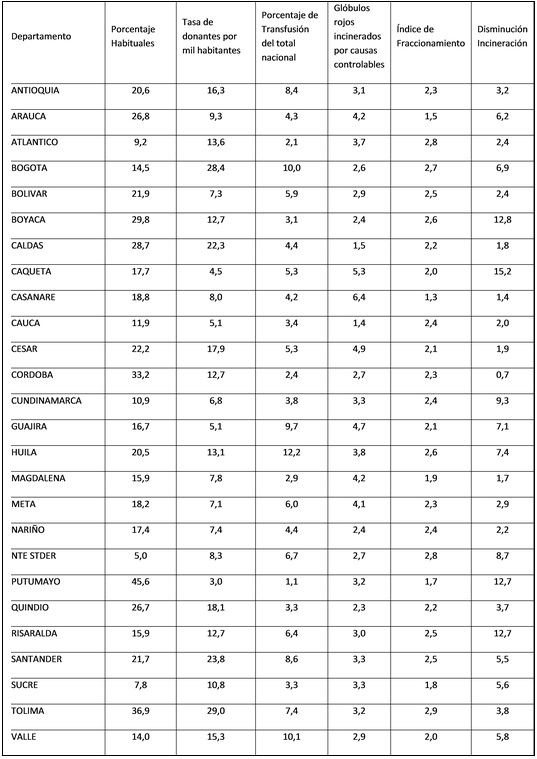 El índice de donaciones es de 15,4 por mil habitantes, empleando para ello la proyección poblacional del DANE por departamentos para 2011; este índice es superior al promedio nacional en 7 departamentos (Tolima con 29, Bogotá 28,4, Santander 23,8, Caldas 22,3, Quindío 18,1, Cesar 17,9 y Antioquia 16,3)9. En estos departamentos se encuentran los principales bancos de sangre distribuidores del país, como son: Fundación Hematológica Colombia, Hemocentro Distrital, Banco de Sangre Higuera Escalante & CIA, Hemocentro y Unidad de Aféresis de Valledupar Ltda. y la Cruz Roja, quienes en su mayoría son los encargados de la provisión de componentes sanguíneos en todo el país incluyendo los 7 departamentos en los que solo se cuenta con servicio transfusional (Amazonas, Archipiélago de San Andrés, Chocó, Guaviare, Guanía, Vaupés y Vichada).