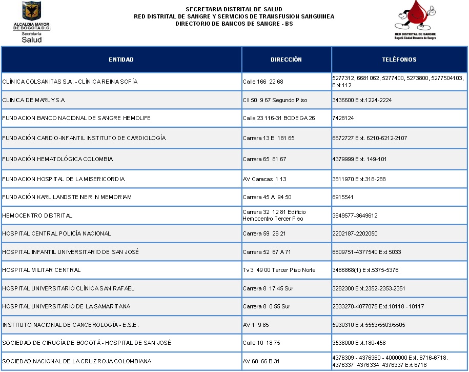 Fuente:www.saludcapital.gov.co/DDS/Documentos%20Red%20Sangre/DIRECTORIO%20RED%20DISTRITAL%20SANGRE_BS.pdf . consultado el 05 mayo de 2014.