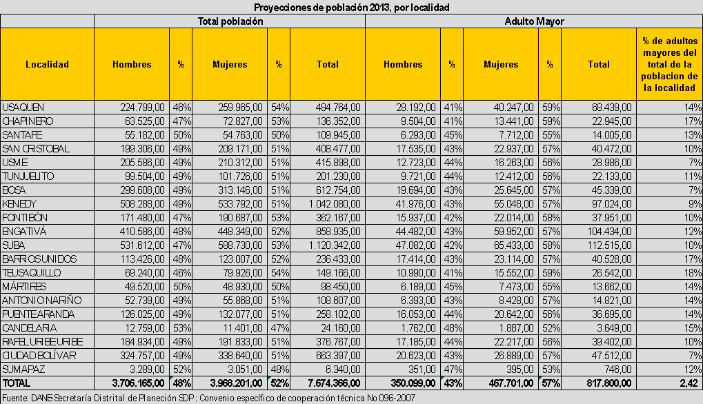 Para el caso de la proyección 2013 de población por localidad, la siguiente tabla nos muestra la incidencia de la población mayor en cada localidad con relación a las otras generaciones.