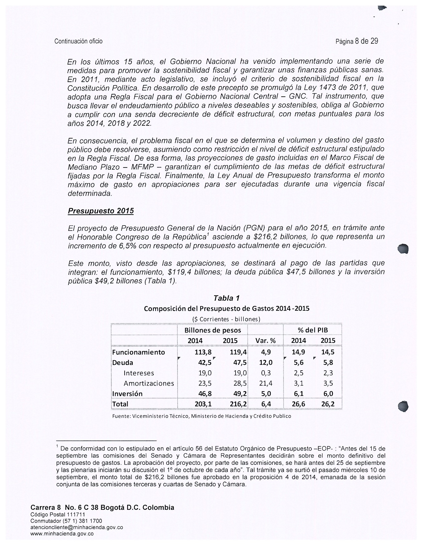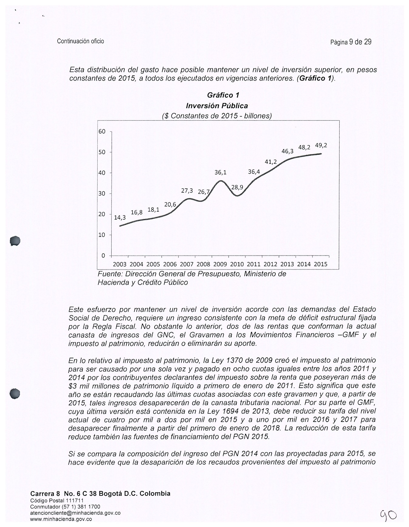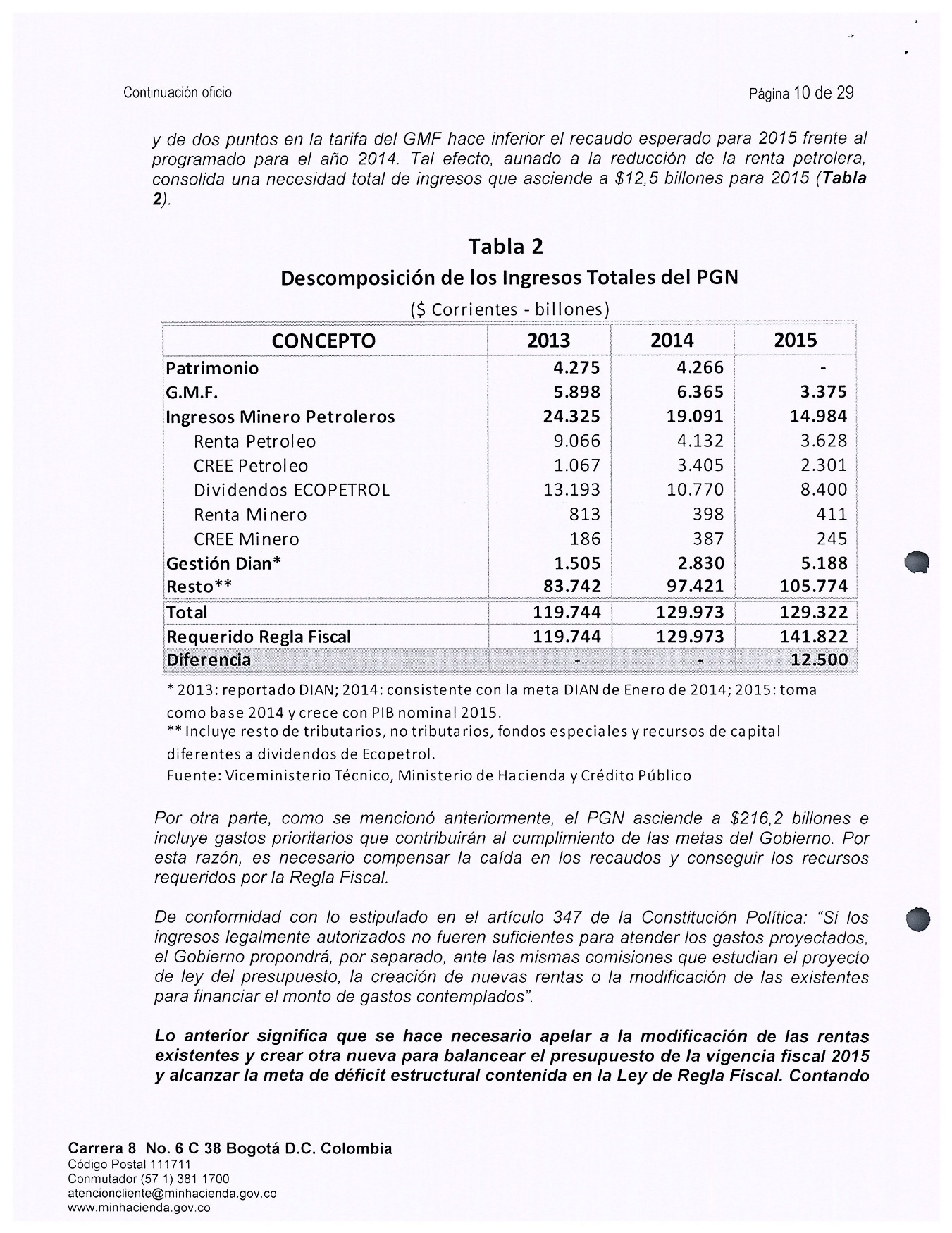 75 Entre los ingresos están principalmente los dividendos de Ecopetrol, que en los años 2013 y 2014 habían sido superiores a los diez billones de pesos. Entre los impuestos están el de renta y el cree, que en el año 2013 superaron sumados los diez billones de pesos y que en el año 2014 fueron superiores a los siete y medio billones de pesos (Supra II, 3.4., tabla 2)