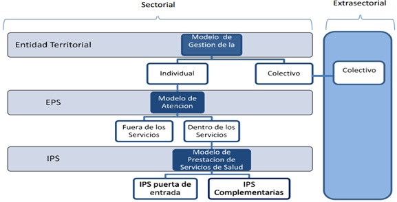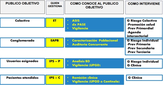 Fuente: Minsalud. Tanto la gestión de riesgo colectivo como la gestión del riesgo individual se operativizan a través del modelo integral de salud para Bogotá y utilizan estrategias como las rutas de atención. Atención Primaria en Salud y redes integradas: De acuerdo con la OPS, los sistemas de salud de las Américas se caracterizan por altos niveles de fragmentación de sus servicios de salud. La fragmentación es una causa importante del bajo nivel de desempeño de los servicios y sistemas de salud. La fragmentación puede generar por sí misma, o con otros factores, dificultades en el acceso a los servicios, prestación de servicios de baja calidad técnica, uso irracional e ineficiente de los recursos disponibles, aumento innecesario de los costos de producción y poca satisfacción de los usuarios con los servicios recibidos. Por otro lado, la fragmentación puede ser la consecuencia de la acción de otros factores que la causan (ej. financiamiento insuficiente que impide la prestación de servicios integrales), o puede ser un factor que incide sobre otros factores causales, los que a su vez impactan negativamente sobre el desempeño general del sistema (ej. la duplicación de exámenes de laboratorio que trae aparejado un incremento innecesario de los costos, los que a su vez disminuyen el nivel de financiamiento.(OPS 2010) La experiencia acumulada demuestra que la excesiva fragmentación de los servicios de salud genera dificultades en el acceso a los servicios, la prestación de servicios de baja calidad técnica, el uso irracional e ineficiente de los recursos disponibles, un incremento innecesario de los costos de producción, y una baja satisfacción de los ciudadanos con los servicios recibidos. (OPS 2010) Las Redes Integradas de Servicios de Salud pueden definirse como "una red de organizaciones que presta, o hace los arreglos para prestar, servicios de salud equitativos e integrales a una población definida, y que está dispuesta a rendir cuentas por sus resultados clínicos y económicos y por el estado de salud de la población a la que sirve". Como se desprende de la definición anterior, las RISS no requieren que todos los servicios que las componen sean de propiedad única. Por el contrario, algunos de sus servicios pueden prestarse por medio de una gama de arreglos contractuales o alianzas estratégicas en lo que se ha denominado "integración virtual". Esta característica de las RISS permite buscar opciones de complementación de los servicios entre organizaciones de distinta naturaleza jurídica, ya sean públicas o privadas. (OPS 2010) En ellas el prestador primario, se define como la puerta de entrada, el cual debe caracterizar e intervenir sobre riesgos individuales y colectivos para la salud, realiza prestaciones individuales y cuenta con las especialidades básicas. Los prestadores complementarios incluyen los especialistas, sub-especialistas y servicios especializados. El fortalecimiento de los prestadores exige el trabajo en redes de salud integrales donde las personas reciban un continuo de servicios de promoción, prevención, diagnóstico, tratamiento, gestión de enfermedades, rehabilitación y cuidados paliativos. (OMS 2008) El modelo asistencial propuesto por la OPS incluye: Población y territorio a cargo definido y amplio conocimiento de sus necesidades y preferencias en cuestiones de salud, que determinan la oferta de servicios de salud; * Una extensa red de establecimientos de salud que presta servicios de promoción, prevención, diagnóstico, tratamiento, gestión de enfermedades, rehabilitación y cuidados paliativos, y que integra los programas focalizados en enfermedades, riesgos y poblaciones específicas. * Un primer nivel de atención multidisciplinario que cubre a toda la población y sirve como puerta de entrada al sistema, * Prestación de servicios especializados en el lugar más apropiado, que se ofrecen de preferencia en entornos extra hospitalarios; * Existencia de mecanismos de coordinación asistencial a lo largo de todo el continuo de los servicios de salud * Atención de salud centrada en la persona, la familia y la comunidad. * Un sistema de gobernanza único para toda la red; * Participación social amplia * Acción intersectorial y abordaje de los determinantes de la salud y la equidad en salud. * Gestión integrada de los sistemas de apoyo clínico, administrativo y logístico; * Recursos humanos suficientes, competentes, comprometidos y valorados por la red; * Sistema de información integrado * Gestión basada en resultados. * Financiamiento adecuado e incentivos financieros alineados con las metas de la red. (OPS 2010) En el Plan de desarrollo 2014-2018 define que a través de la articulación y armonización del aseguramiento, la prestación de servicios de salud y el desarrollo de las políticas, programas e intervenciones en salud pública, el Modelo Integral de Atención en Salud (MIAS) busca enfrentar los retos del sistema de salud colombiano en materia de acceso efectivo, oportunidad, calidad e integralidad de los servicios de salud teniendo en cuenta las particularidades de las personas, familias y comunidades. Lo anterior, bajo el enfoque de gestión integral de riesgo en salud, implica que cada uno de los agentes del SGSSS desarrolle un conjunto de acciones que, sobre una población específica, con individuos identificables y caracterizables, que permita: * Disminuir la probabilidad de ocurrencia de un evento no deseado, evitable y negativo para la salud del individuo por medio de acciones de promoción y prevención; * Mitigar las consecuencias derivadas de la ocurrencia de dichos eventos; * generar capacidad individual y colectiva para sobreponerse de manera eficiente ante una nueva ocurrencia de dichos eventos; * Aplicar Rutas Integrales de Atención (RIA) y Rutas de Atención Específica para los grupos de riesgo priorizados. * Desarrollar la estrategia de la atención primaria en salud (APS) con un en