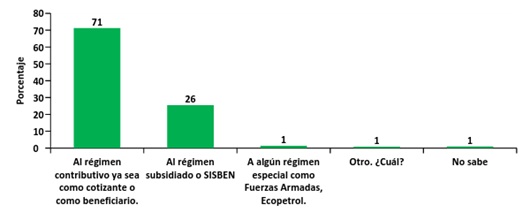 Fuente: Encuesta de Percepción Ciudadana. Programa Bogotá Cómo Vamos, 2014. Del total del porcentaje de personas que se encuentran vinculadas al SGSSS, el 71% se encuentra afiliada a través del régimen contributivo, el 26% al régimen subsidiado o a través del SISBEN y el 1% a algún régimen especial (Fuerzas Armadas, Ecopetrol). El 2% restante se encuentra afiliado a otro o no sabe, tal y como se observa en la Gráfica 2. Gráfica 2: Porcentaje de afiliación por tipo de régimen.