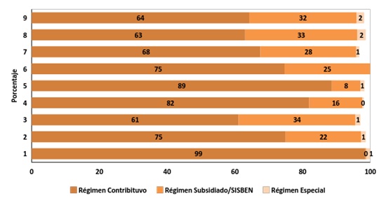 Fuente: Encuesta de Percepción Ciudadana. Programa Bogotá Cómo Vamos, 2014. El mayor porcentaje de población afiliada al régimen contributivo se encuentra en los estratos altos así como en las zonas de Chapinero y Norte. A su vez el mayor porcentaje de población afiliada al régimen subsidiado se encuentra en los estratos bajos y en las zonas Sur-Occidental y Occidental. No se encuentran diferencias respecto a la distribución de la población afiliada a regímenes especiales por grupos de estratos. Por zonas, el mayor porcentaje de población afiliada a regímenes especiales se encuentra en las zonas Sur-Occidental y Occidental con 2%, como se puede observar en la Gráfica 3. Gráfica 3: Porcentaje de afiliación por tipo de régimen, por zonas y grupos de estratos.