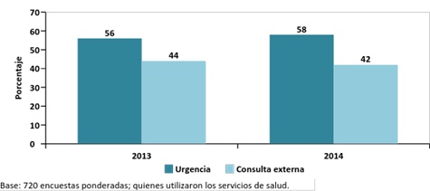 Fuente: Encuesta de Percepción Ciudadana. Programa Bogotá Cómo Vamos, 2014. Asimismo del total de personas que reportaron estar afiliadas al SGSSS, el 22% cuenta con algún tipo de plan o seguro en salud adicional cómo póliza de hospitalización o cirugía, medicina prepagada, plan complementario de salud con alguna EPS, entre otros. Al indagar acerca del tipo de atención requerida (servicio de urgencias o consulta externa), los resultados muestran que la mayoría accede a través de los servicios de urgencias, ya que en el 2014, segundo año en el cual se realizó esta pregunta, este porcentaje aumentó a 58%. A su vez disminuyó el porcentaje de personas que acceden a través de consulta externa. En el 2014 este porcentaje fue del 42% como se observa en la Gráfica 4. Gráfica 4: Porcentaje de personas que utilizaron servicios de salud por consulta externa o por urgencias.