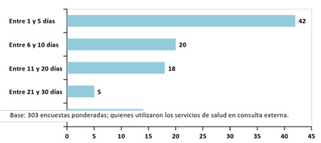 Fuente: Encuesta de Percepción Ciudadana. Programa Bogotá Cómo Vamos, 2014. A su vez, del total de personas que accedieron a los servicios de salud por consulta externa en el 2014, el 42% tuvo que esperar entre 1 y 5 días entre el momento de solicitar la cita y el momento del servicio. Por el contrario, el 14% tuvo que esperar más de 30 días, manteniendo un comportamiento similar presentado en el 2013 (Ver Gráfica 5). Gráfica 5: Porcentaje de personas según días transcurridos entre el momento de pedir la cita y el momento del servicio.
