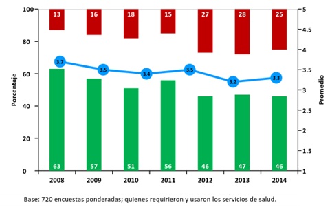 Fuente: Encuesta de Percepción Ciudadana. Programa Bogotá Cómo Vamos, 2014. Frente a la satisfacción con la atención en salud se mantiene casi igual en los últimos tres años, con un 46% de usuarios satisfechos, siendo los dos últimos años los más bajos de la serie que inicia en el año 2008, sin embargo el porcentaje de insatisfechos disminuyó tres puntos porcentuales respecto al comportamiento presentado en el 2013, con un 25% de encuestados insatisfechos con la salud (ver Gráfica 6). Gráfica 6: Porcentaje de satisfacción general con la salud.
