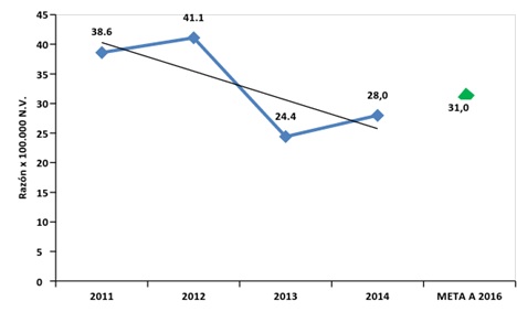 Fuente: Encuesta de Percepción Ciudadana. Programa Bogotá Cómo Vamos, 2014. Indicadores trazadores: Además de los indicadores de percepción obtenidos a partir de la Encuesta de Percepción Ciudadana realizada en el año 2014, y que pueden dar una aproximación frente al acceso y satisfacción con los servicios de salud, se presenta el análisis descriptivo de los principales indicadores trazadores incluidos en el Plan Distrital de Desarrollo Bogotá Humana 2012-2016, a partir de la información suministrada por la Secretaría Distrital de Salud, y con los cuales se puede evidenciar que tan cercano se encuentra el actual plan de desarrollo frente al cumplimiento de las principales metas en salud establecidas, en pro de la garantía del derecho a la salud en el Distrito Capital. Razón de Mortalidad Materna (por 100.000 N.V) La meta establecida en el Plan Distrital de Desarrollo es de reducir a 31 por 100.000 nacidos vivos la razón de mortalidad materna, en coordinación con otros sectores de la administración distrital al año 2016. En general, se observa una disminución en la tendencia de este indicador agregado a nivel distrital, aunque entre los años 2013 y 2014 se presentó un aumento al pasar de 24.5 x 100.000 NV (25 mortalidades) a una razón de 28 casos x 100.000 NV (29 mortalidades), como se puede observar en la Gráfica 9. Se hace la observación que al revisar el Informe del evento mortalidad materna, hasta el periodo epidemiológico XIII, Colombia, 2014, del Instituto Nacional de Salud, (http://www.ins.gov.co/lineas-de-accion/Subdireccion-Vigilancia/Informe%20de%20Evento%20Epidemiolgico/MORTALIDAD%20MATERNA%20Periodo%20XIII%202014.pdf), se reportan de Bogotá 32 casos que equivale a una tasa de 33.86, es decir, se están reportando 4 casos más de mortalidad materna que los reportados por Bogotá para el año 2014. Gráfica 9: Razón de Mortalidad Materna, período 2011-2014.