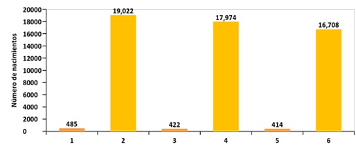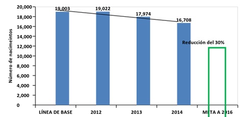 Fuente: Secretaría Distrital de Salud, 2015. *Para muertes fetales, los datos son tomados del Certificado de Nacido Vivo.-Bases de datos DANE-RUAF-ND (Preliminar 2013) **Para embarazos que terminaron en aborto, los datos son tomados del Certificado de defunción muertes fetales.- Bases de datos DANE-RUAF ND.- Sistema de Estadísticas Vitales SDS.-(Preliminar 2013). NOTA: La información del 2014 aún no está disponible, se espera publicación del DANE. Fecha de actualización de datos del RUAF: 19 de enero de 2015. El Plan de Desarrollo Distrital contempla una meta de reducir al 30% los embarazos en adolescentes entre 15 y 19 años, en coordinación y con el apoyo de los demás sectores de la administración distrital a 2016. En la Gráfica 11, se observa que aunque el número de nacimientos ha tenido un comportamiento descendente, no se logrará la meta propuesta. Gráfica 11: Nacimientos en mujeres de 15 a 19 años