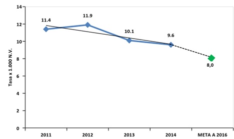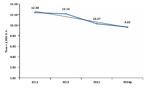 Fuente:Elaboración propia con base en datos de la Secretaría Distrital de Salud, 2015. *NOTA: El cálculo de la línea de tendencia incluye solamente los datos del 2011 al 2014. Aunque la Secretaría Distrital de Salud hace el cálculo de la tasa de mortalidad en menores de 5 años tomando como denominador la población menor de 5 años (por proyección), se incluye para el presente informe la tasa de mortalidad en menores de 5 años, calculada tomando como denominador los nacidos vivos, puesto que permite una mayor comparabilidad. Con este cálculo la ciudad ha pasado de una tasa de mortalidad en menores de 5 años de 12.38 por 1.000 N.V., a una tasa de 9.63 por 1.000 N.V. (Ver Gráfica 14): Gráfica 14: Mortalidad en menores de 5 años por 1.000 N.V., período 2011-2014p.