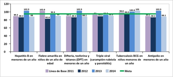 Fuente: Secretaría Distrital de Salud, 2015. Datos: Grupo ERA Subdirección de Vigilancia en Salud Pública. Fecha de actualización de datos del RUAF: 19 de enero de 2015. * Cobertura de vacunación: La meta propuesta dentro del Plan de Desarrollo Distrital es lograr 95% de cobertura en vacunación para cada uno de los biológicos del Programa Ampliado de Inmunizaciones, a 2016. Como se puede observar en la Gráfica 15, con el único biológico que se mantiene el logro de la cobertura durante el período analizado es con la vacuna Tuberculosis BCG, presentando coberturas por encima del 95%. En el caso de vacunas como Hepatitis B, Fiebre amarilla, DPT, y Antipolio, llama la atención que si bien en el 2013 se lograron coberturas por encima de la meta establecida, para el año 2014 se presenta una disminución en la cobertura por debajo del 95%. Gráfica 15: Cobertura de vacunación, período 2012-2014.