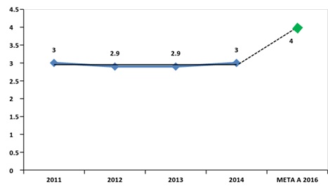 Fuente: Elaboración propia con base en datos de la Secretaría Distrital de Salud, 2015. Dentro de las dificultades que la Secretaría Distrital de Salud plantea como causas de no cumplimiento se encuentran: 1. La debilidad en el seguimiento estricto a cohortes de recién nacidos por las Empresas Administradoras de Planes de Beneficios EAPB. 2. Estrategia de comunicación no permanente. 3. Información generada por medios de comunicación, creo en los usuarios resistencia a la aplicación de biológicos. 4. El desavastecimiento de vacunas acelulares (hexa-penta) que son administradas con costo por la red privada, impactando en la población menor de un año de edad. De igual manera falta de vacuna de polio intramuscular entregada por el Ministerio de Salud y Protección Social MSPS, para la población de riesgo o conviviente con inmunocomprometidos. A su vez la Secretaría Distrital de Salud hace las siguientes propuestas con el fin de mejorar la cobertura: 1. Hacer seguimiento a las metas de las EAPB con el diseño de planes de mejoramiento, y evaluación mensual según avances registrados con cada IPS. 2. Realizar asistencia técnica distrital por redes y soporte con equipos extramurales con mayores destrezas y habilidades. 3. Estandarizar una estrategia masiva y permanente a través del programa Territorios Saludables que promueva, movilice, informe y adhiera la comunidad hacia los servicios de vacunación. * Mediana de la duración de la lactancia materna exclusiva: Aunque la meta propuesta es de incrementar a 4 meses la lactancia materna exclusiva en los niños y niñas menores de 6 meses, en coordinación y con el apoyo de los demás sectores de la administración distrital al 2016; la mediana de lactancia materna se ha mantenido prácticamente estacionaria en los últimos tres años: 2.9 a 3 meses, y con tendencia a mantener este comportamiento, lo que dificulta el logro de la meta planteada (Ver Gráfica 16). Gráfica 16: Mediana de lactancia materna, período 2011-2014.