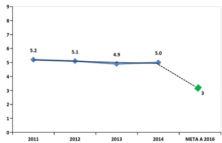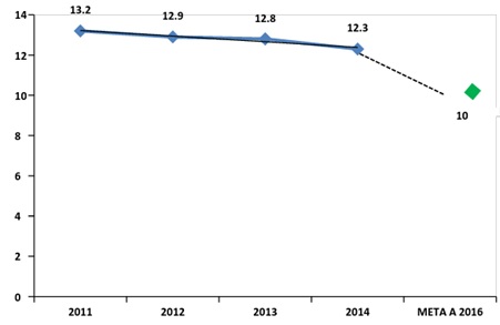 * Mortalidad en menores de cinco años: La meta propuesta dentro del Plan Distrital de Desarrollo es la de reducir a 15.7 por 10.000 la tasa de mortalidad en niños y niñas menores de 5 años, en coordinación con los sectores de la administración distrital al año 2016. Según información de la Secretaría Distrital de Salud, la mortalidad en menores ha descendido un 18.8% entre 2011 y 2013 y un 22.9% hasta 2014, lo cual significa que la tasa actual está 3.2 puntos por encima de la meta de gobierno. Se requiere una reducción del 17% para alcanzar la meta. Gráfica 13: Mortalidad en menores de 5 años, período 2011-2014.
