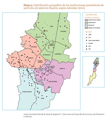 Fuente: Secretaria de salud de Bogotá. Rendición de cuentas 2012. En conjunto, la red pública hospitalaria de Bogotá produjo cerca de 4,8 millones de consultas médicas por año en el trienio 2008-2010, de las cuales el 75% fueron electivas y el 25% fueron urgentes. Se observa un alto crecimiento (72,7%) de las consultas urgentes especializadas entre 2007 y 2008. Durante el periodo de análisis, se observa que el mayor aporte a la producción de servicios de salud en la red adscrita lo dieron las empresas sociales del Estado de tercer nivel, con el 62,3%, seguido de un 29,1% de segundo nivel y un 8,6% de primer nivel. El porcentaje de partos por cesáreas en hospitales de tercer nivel fue del 35,1%, y en hospitales de segundo nivel, del 28,7%. En cuanto al servicio de hospitalización, con la capacidad instalada disponible en la red adscrita durante el 2011 (2.895 camas - 1.053.464 días camas disponibles) en los servicios de medicina general, medicina interna, ginecobstetricia, pediatría, neonatología, ginecología, obstetricia, quirúrgicos, VIH, quemados, salud mental, se generaron un total de 218.685 egresos (Secretaria salud Bogota 2012). Desde el punto de vista de los recursos presupuestales ejecutados por la red pública distrital adscrita a la Secretaría Distrital de Salud de Bogotá para la prestación de los servicios de salud de promoción, prevención, diagnóstico, tratamiento y rehabilitación en los niveles básico, intermedio, especializado y subespecializado, durante el periodo 2004-2011, en promedio se ejecutaron 815.874 millones al año; así, se registró un crecimiento nominal del 168% en 2011, respecto a lo ejecutado en 2004 (Secretaria salud Bogota 2012). En cuanto a la deuda de las EPS con la red hospitalaria de Bogotá, el subsecretario Urrego afirma que al iniciar la actual administración, la deuda ascendía a 260 mil millones de pesos y hoy la deuda total es de 876 mil millones de pesos". (Canal Capital 2015) En Bogotá, al igual que en el resto del país, uno de los principales problemas no superado por el Sistema General de Seguridad Social en Salud es la fragmentación de los servicios de salud, la cual se ha manifestado fundamentalmente como falta de acceso a los servicios y de oportunidad en la atención; pérdida de continuidad de los servicios asistenciales; falta de consistencia de los servicios con necesidades y expectativas de la población; falta de coordinación entre los diferentes niveles y puntos de atención; duplicación de servicios e infraestructura que lleva a subutilización de capacidad instalada, o sobreutilización de recursos, en otros casos; distribución inequitativa de puntos de atención; débil capacidad resolutiva del primer nivel de atención; sin contrarreferencia de los niveles superiores al primero, y uso de servicios de urgencia para la atención de medicina general y especializada sin utilizar consulta ambulatoria. (Secretaria salud Bogotá 2012)" La propuesta que se presenta tiene como prioridad el compromiso de campaña del alcalde en relación con que "Los ciudadanos recuperarán el derecho a acceder a un sistema de salud que los atienda con dignidad, de forma rápida y efectiva" (Peñalosa 2015) Adicionalmente los compromisos adquiridos son: "Reactivar y renovar el Consejo Distrital de Seguridad Social, bajo el liderazgo del Distrito y con participación de las comunidades, crear Equipo Especializado en Administración y Finanzas por hospital , para apoyar actividades de planificación y control, desarrollar una estrategia renovada de atención primaria que responda a la demanda de oportunidad, calidad y priorización de los servicios, trabajar para elevar la calidad, mejorar el acceso y hacer un mayor control social de los servicios de salud, Crear más de 20 Centros de Atención Prioritaria en Salud (CAPS), distribuidos en todas las localidades de la ciudad, estrategia de APS resolutiva, con equipos extramurales con EPS y prestadores, que busquen, atiendan y sigan poblaciones vulnerables, programa Preventivo Integral con EPS, IPS y Secretaría, para examen preventivo anual que detecte precozmente enfermedades y riesgos, Central de Urgencias del Sur y nuevo Centro Regulador de Urgencias, con nuevo modelo de Ambulancias y Atención Pre-hospitalaria, Acuerdos de Gestión por Desempeño entre hospitales y administración, para garantizar atención oportuna y satisfactoria"". (Peñalosa 2015) Consejo Distrital de Seguridad Salud en Salud Ampliado Este Consejo es un organismo colegiado de carácter asesor para la adopción y adaptación de políticas salud, liderado por la Secretaría de Salud, con participación de las RISS y los prestadores privados, con participación de la EPS Distrital y las demás y con participación de comunidades usuarias de servicios. El Consejo Distrital de Seguridad Social en Salud Ampliado de Bogotá, estará conformado por los siguientes miembros: * El Alcalde Mayor de Bogotá o su delegado, quien presidirá las sesiones. * El Secretario Distrital de Salud de Bogotá, D.C., quien ejercerá la presidencia cuando el Alcalde delegue su representación. * El Secretario de Hacienda Distrital de Bogotá o su delegado. * Un representante de los empleadores, * Un representante de los trabajadores. * El Gerente de la EPS Capital salud. * Un representante de las Entidades Promotoras de Salud distintas a Capital salud. * Dos representantes de las Instituciones Prestadoras de Servicios de Salud, una pública y una privada * Un representante de las facultades de Salud con sede en la ciudad que tengan formación de posgrado en Salud Pública o áreas afines * Un representante de los profesionales del área de la salud * Un representante por las asociaciones o alianzas de usuarios la función esencial de este Consejo es la de asesorar a la Secretaría Distrital de Salud en la formulación de planes, estrategias, programas y proyectos de salud, y en el desarrollo de las políticas de Seguridad Social e